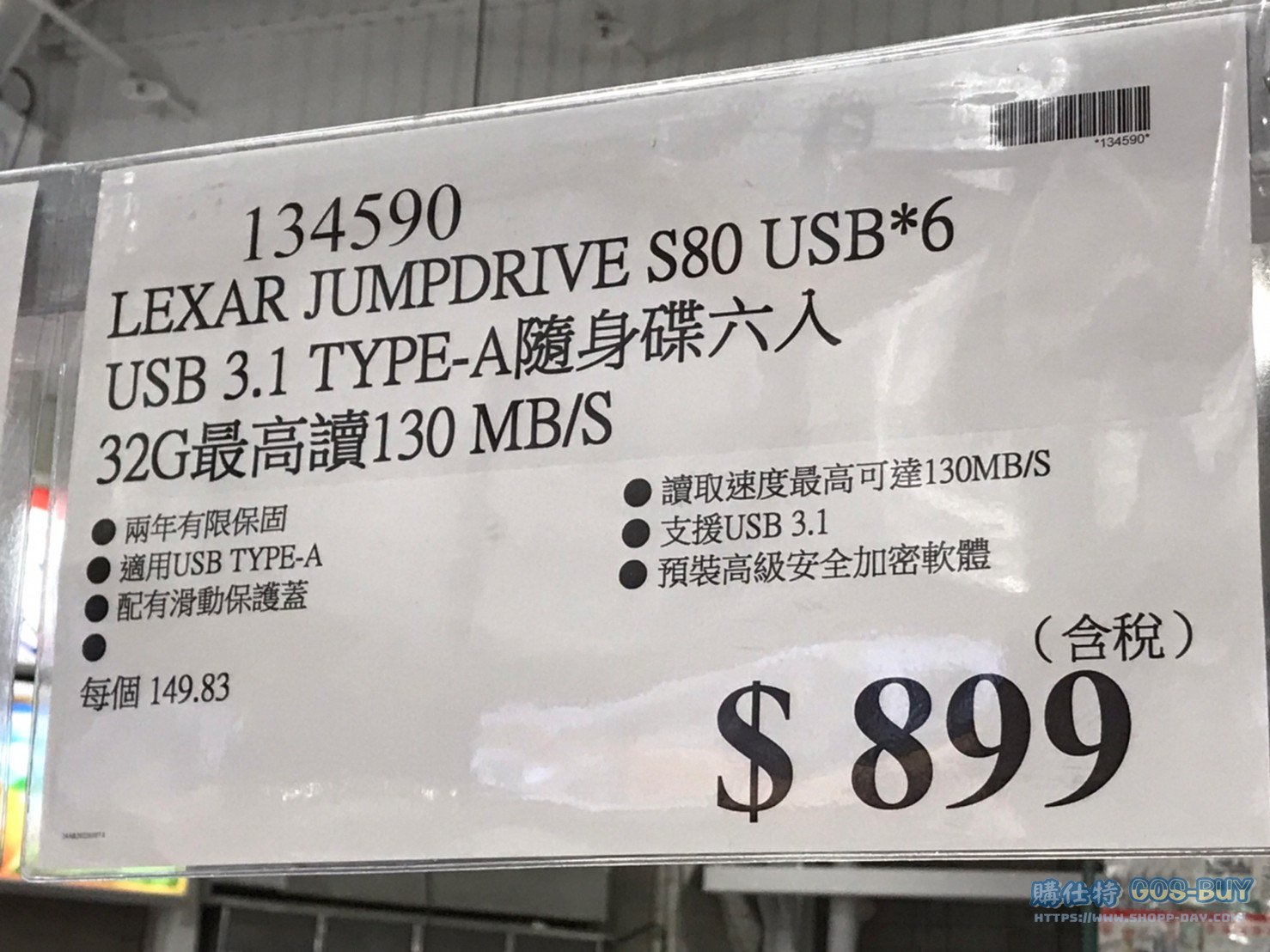 家電子產品隨身碟 LEXAR USB 3.1 TYPE-A 隨身碟六入 32G 最高讀130MB/S #134590 By 網站小編 2022 年 5 月 1 日 256 產品資訊 產品資訊 產品名稱LEXAR JUMPDRIVE S80 USB*6 USB 3.1 TYPE-A隨身碟六入 32G 最高讀130MB/S #134590價格899產地中國包裝規格32G 六入 (型號:S80)保存期限保固三年備註兩年有限保固適用USB TYPE-A配有滑動保護蓋讀取速度最高可達130MB/S支援USB 3.1 預裝高級安全加密軟體→商品問題回報← 相關 標籤32GLEXARTYPE-A隨身碟 前一篇文章好自在日用液體衛生棉 每盒36片/入 #115671下一篇文章SANDISK USB 64GB 三入裝 TYPE-C & A二合一隨身碟 #130577 網站小編https://shopp-day.com 或許你也感興趣 價格優惠資訊 2025好市多客製生日蛋糕價格表 價格優惠資訊 好市多Line社群加入方法 保健品&藥品 新甘木堅胃腸藥顆粒40包 #194496 購仕特-CosBuy 查詢排行 價格優惠資訊 2025好市多客製生日蛋糕價格表 價格優惠資訊 好市多Line社群加入方法 保健品&藥品 新甘木堅胃腸藥顆粒40包 #194496 價格優惠資訊 2025好市多會員護照-春季專案商品一覽表 價格優惠資訊 好市多美國牛肉整箱銷售價格表(2024/5/7) 裝載更多 熱門推薦 價格優惠資訊 Costco好市多 iphone14 Pro ProMax 價格表 價格優惠資訊 Costco 好市多 Apple Watch 2022年版價格表 家庭劇院 BOSE兩件式家庭劇院組 #137039 螢幕 MSI 27吋IPS電競螢幕FHD平面/144HZ OPTIX G271 #132273 其他電子產品 MIPRO 手提藍牙無線擴音機MA-708 #118489 裝載更多