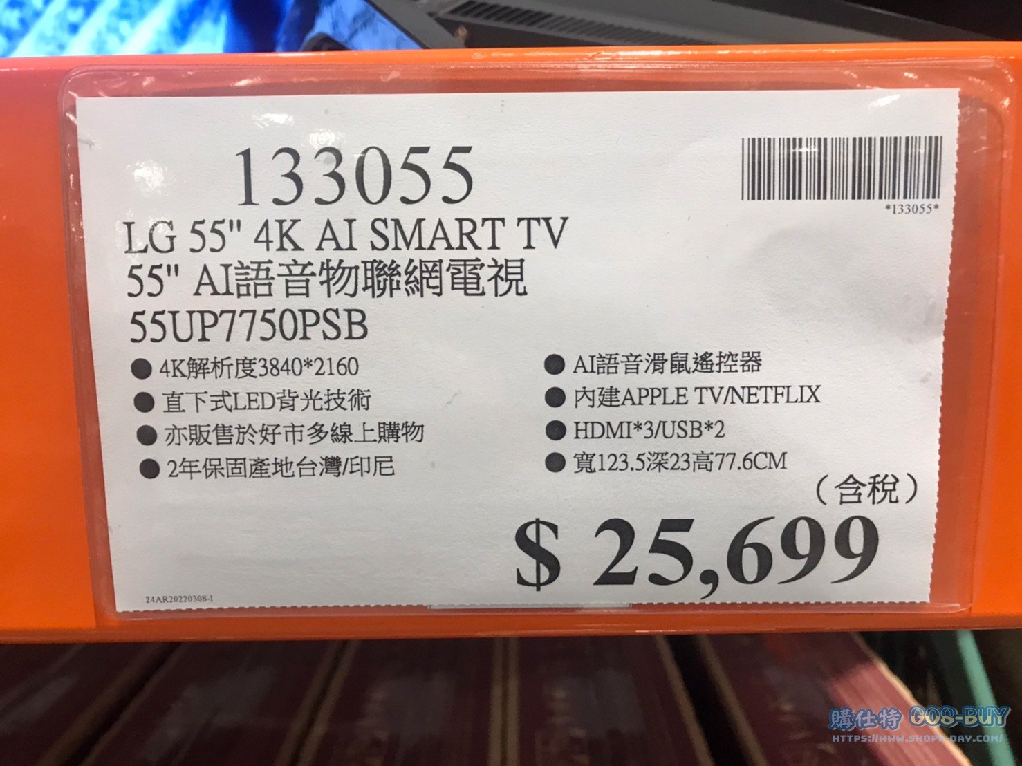 家家電產品 LG 55″ 4K AI SMART TV 55″ AI語音物聯網電視 55UP7750PSB #133055 By 網站小編 2022 年 4 月 11 日 286 產品資訊 產品資訊 產品名稱LG 55″ 4K AI SMART TV 55″ AI語音物聯網電視 55UP7750PSB #133055價格25699產地台灣/印尼包裝規格一入(規格:55UP7750PSB)保存期限保固兩年備註4K解析度3840*2160直下式LED背光技術AI 語音滑鼠遙控器內建APPLE TV / NETFLIXHDMI*3 / USB*2寬123.5 深23 高77.6CM亦販售於好市多線上購物2年保固/產地:印尼/台灣→商品問題回報← 相關 標籤4K55吋HDMILGUSB樂金 前一篇文章LG 55″ 4K OLED SMART TV 55吋OLED AI物聯網電視 #133056下一篇文章US BROW BEAR 懸臂拉伸式電視壁掛架 適用48~80吋螢幕 #119117 網站小編https://shopp-day.com 或許你也感興趣 價格優惠資訊 2025好市多客製生日蛋糕價格表 價格優惠資訊 好市多Line社群加入方法 保健品&藥品 新甘木堅胃腸藥顆粒40包 #194496 購仕特-CosBuy 查詢排行 價格優惠資訊 2025好市多客製生日蛋糕價格表 價格優惠資訊 好市多Line社群加入方法 保健品&藥品 新甘木堅胃腸藥顆粒40包 #194496 價格優惠資訊 2025好市多會員護照-春季專案商品一覽表 價格優惠資訊 好市多美國牛肉整箱銷售價格表(2024/5/7) 裝載更多 熱門推薦 咖啡機 DOLCE GUSTO GENIO S+ COMBO 雀巢義式膠囊咖啡機 含128顆咖啡膠囊 #128877 冰箱 SHARP夏普變頻雙門冰箱253公升 SJ-H25Y-WH #137098 咖啡機 PHILIPS ESPRESSO MACHINE全自動義式咖啡機 #130890 其他家電用品 TRESANTI FIREPLACE 造型電暖爐 尺寸約193X50X70公分 #124273 冰箱 SAMSUNG 623公升雙循環雙門冰箱#126223 裝載更多