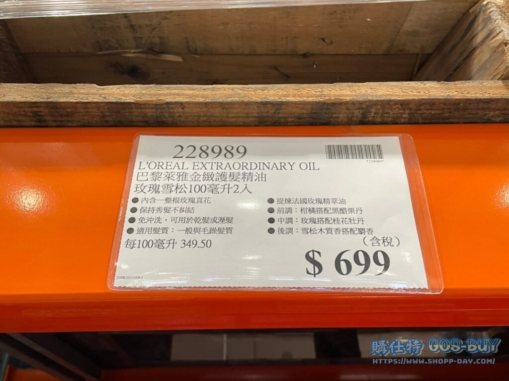家廚房與居家生活相關 L’OREAL EXTRAORDINARY OIL 巴黎萊雅金緻護髮髮油 玫瑰雪松100毫升2入 #228989 By 網站小編 2022 年 2 月 25 日 290 產品資訊 產品資訊 產品名稱L’OREAL EXTRAORDINARY OIL 巴黎萊雅金緻護髮髮油 玫瑰雪松100毫升2入 #228989價格699產地中國包裝規格100毫升2入保存期限3年備註內含一整根玫瑰真花保持秀髮不糾結免沖洗 可用於乾髮或濕髮適用髮質:一般與毛躁髮質提煉法國玫瑰精萃油前調:柑橘搭配黑醋栗丹中調:玫瑰搭配桂花牡丹後調:雪松木質香搭配麝香→商品問題回報← 相關 標籤巴黎萊雅精油護髮 前一篇文章科克蘭阿拉斯加野生魚油軟膠囊#113415下一篇文章CENTELLIAN 24森特蓮 保濕雙效面霜55公克X2 #128660 網站小編https://shopp-day.com 或許你也感興趣 價格優惠資訊 2025好市多客製生日蛋糕價格表 價格優惠資訊 好市多Line社群加入方法 保健品&藥品 新甘木堅胃腸藥顆粒40包 #194496 購仕特-CosBuy 查詢排行 價格優惠資訊 2025好市多客製生日蛋糕價格表 價格優惠資訊 好市多Line社群加入方法 保健品&藥品 新甘木堅胃腸藥顆粒40包 #194496 價格優惠資訊 2025好市多會員護照-春季專案商品一覽表 價格優惠資訊 好市多美國牛肉整箱銷售價格表(2024/5/7) 裝載更多 熱門推薦 廚房與居家生活相關 普拿疼伏冒熱飲20包 #84499 廚房與居家生活相關 DOMAINE DE LA BAUME 波姆酒莊金牌FITOU紅酒 #121971 廚房與居家生活相關 SIMON LI三人座牛皮沙發#1695608 廚房與居家生活相關 TAISHO大正胃腸藥顆粒52包 #126969 廚房與居家生活相關 IDEA NUOVA 摺疊椅 #1393843 裝載更多