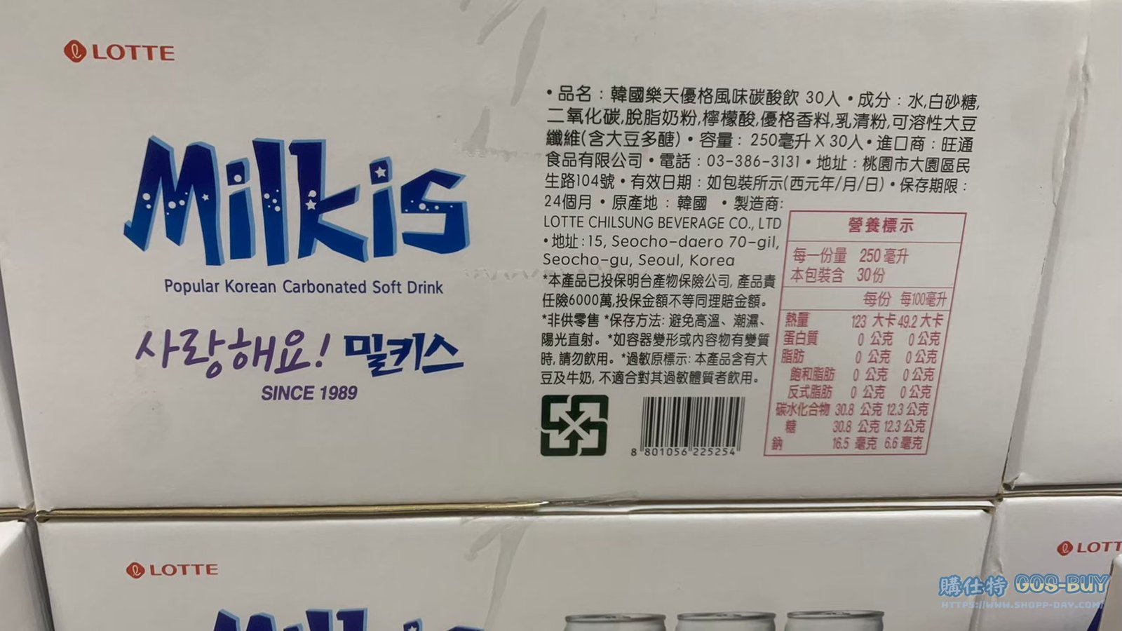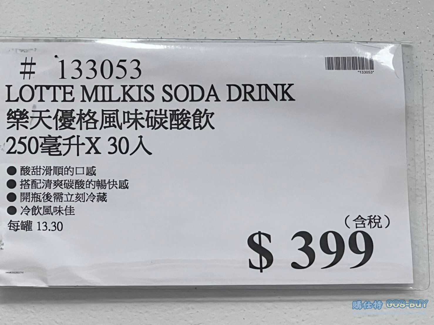家零食&飲料 LOTTE 樂天優格風味碳酸飲 250毫升X30入 #133053 By 網站小編 2021 年 12 月 20 日 264 產品資訊 產品資訊 產品名稱LOTTE MILKIS SODA DRINK 樂天優格風味碳酸飲 250毫升X30入 #133053價格399產地韓國包裝規格250毫升X30入 每罐11.3元保存期限依包裝所示備註酸甜滑順的口感搭配清爽碳酸的暢快感開瓶後須立刻冷藏冷飲風味佳→商品問題回報← 相關 標籤優格樂天氣泡飲韓國飲料 前一篇文章瑪利兄弟遙控越野賽車 2入 #1540857下一篇文章冷凍蒲燒海鰻 SEASONED CONGER EEL 500公克X2入 #385072 網站小編https://shopp-day.com 或許你也感興趣 價格優惠資訊 2025好市多客製生日蛋糕價格表 價格優惠資訊 好市多Line社群加入方法 保健品&藥品 新甘木堅胃腸藥顆粒40包 #194496 購仕特-CosBuy 查詢排行 價格優惠資訊 2025好市多客製生日蛋糕價格表 價格優惠資訊 好市多Line社群加入方法 保健品&藥品 新甘木堅胃腸藥顆粒40包 #194496 價格優惠資訊 2025好市多會員護照-春季專案商品一覽表 價格優惠資訊 好市多美國牛肉整箱銷售價格表(2024/5/7) 裝載更多 熱門推薦 美國零食 科克蘭葡萄乾巧克力#959987 冷藏飲品 BLUE DIAMOND 無糖原味杏仁飲1.89L #129794 西班牙零食 MR.BROWNIE 巧克力布郎尼#153753 泰國零食 A&R牛奶巧克力迷你甜筒餅乾#1744884 比利時零食 科克蘭烈酒與波特酒巧克力 #1351451 裝載更多