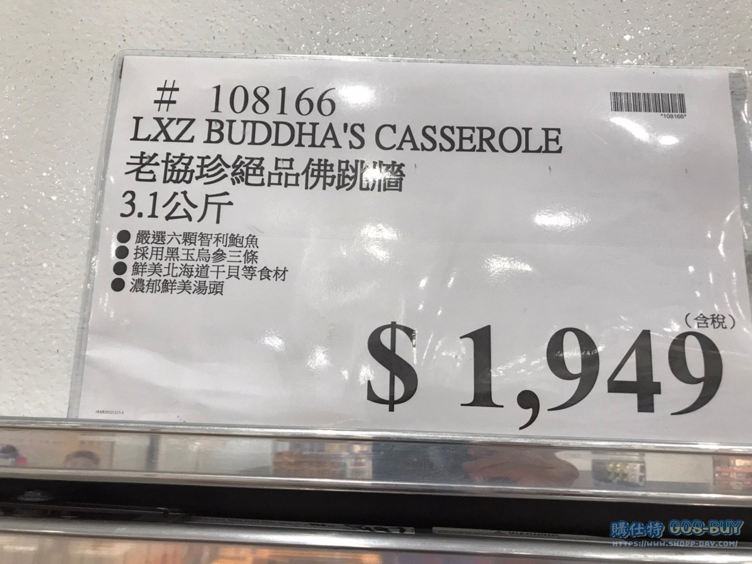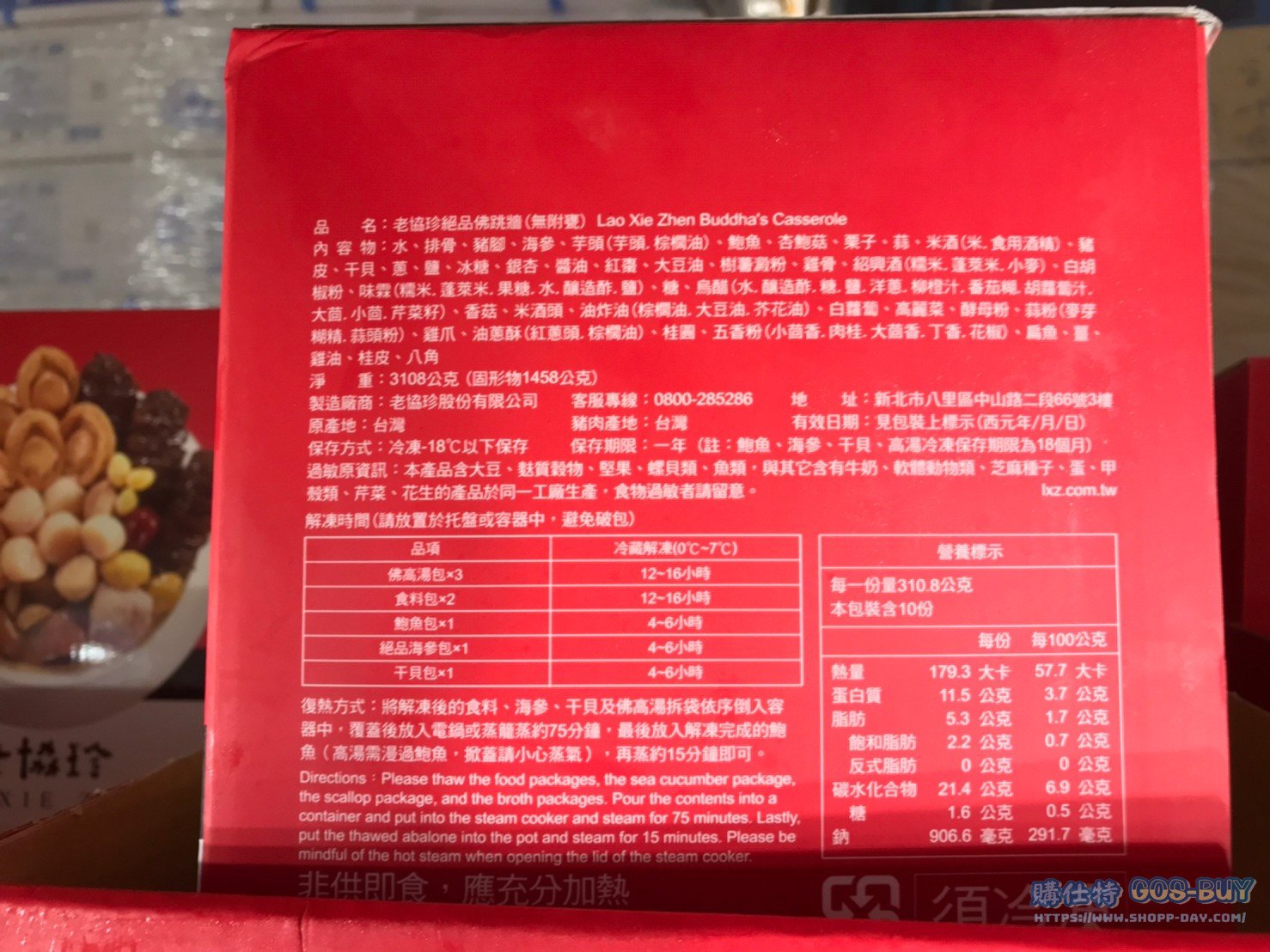 家食品麵包類冷凍食品 老協珍絕品佛跳牆#108166 By 網站小編 2021 年 12 月 28 日 275 產品資訊 產品資訊 產品名稱LXZ BUDDHA’S CASSEROLE 老協珍絕品佛跳牆 3.1公斤 #108166價格1949產地台灣包裝規格3.1公斤保存期限依包裝所示備註嚴選六顆智利鮑魚採用黑玉烏參三條鮮美北海道干貝等食材濃郁鮮美湯頭2022/12/16查價價格由1839漲價為1949漲價110元→商品問題回報← 相關 標籤北海道干貝烏參老協珍鮑魚 前一篇文章晶華冷凍花菇干貝雞湯 2600公克 #130288下一篇文章SLAZENGER練習網球 #131633 網站小編https://shopp-day.com[td_block_7 block_template_id="td_block_template_8" custom_title="大家也在找" border_color="#81d742" category_id="_current_tag"] 或許你也感興趣 價格優惠資訊 2025好市多客製生日蛋糕價格表 價格優惠資訊 好市多Line社群加入方法 保健品&藥品 新甘木堅胃腸藥顆粒40包 #194496 購仕特-CosBuy 查詢排行 價格優惠資訊 2025好市多客製生日蛋糕價格表 價格優惠資訊 好市多Line社群加入方法 保健品&藥品 新甘木堅胃腸藥顆粒40包 #194496 價格優惠資訊 2025好市多會員護照-春季專案商品一覽表 價格優惠資訊 好市多美國牛肉整箱銷售價格表(2024/5/7) 裝載更多 熱門推薦 價格優惠資訊 2025好市多客製生日蛋糕價格表 價格優惠資訊 好市多美國牛肉整箱銷售價格表(2024/5/7) 價格優惠資訊 好市多日本和牛價格表 2024.4.29更新 冷藏食品 美國特選無骨牛小排火鍋片#25737 冷藏食品 舊振南英式馬芬米福堡#143387 裝載更多