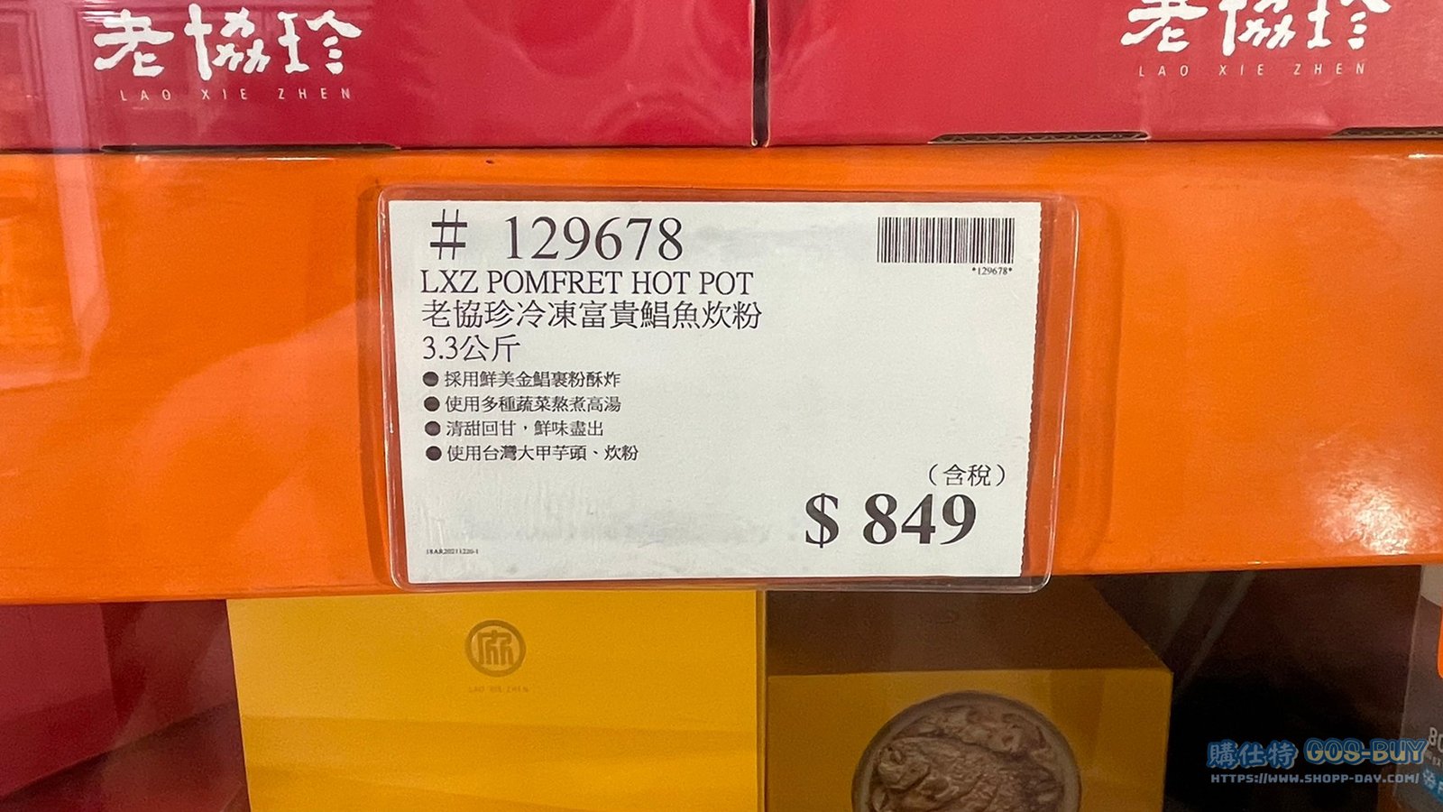 家食品麵包類冷凍食品 LXZ POMFRET HOT POT 老協珍冷凍富貴鯧魚炊粉 3.3公斤 #129678 By 網站小編 2022 年 5 月 21 日 264 產品資訊 產品資訊 產品名稱LXZ POMFRET HOT POT 老協珍冷凍富貴鯧魚炊粉 3.3公斤 #129678價格849產地台灣包裝規格3.3公斤保存期限依包裝所示備註採用鮮美金錩裹粉酥炸使用多種蔬菜熬煮高湯清田回甘,鮮味盡出使用大甲芋頭、炊粉→商品問題回報← 相關 標籤老協珍鯧魚 前一篇文章銀川有機米粉 #126230下一篇文章CHOBANI 四種水果口味希臘式優格 #1005641 網站小編https://shopp-day.com 或許你也感興趣 價格優惠資訊 2025好市多客製生日蛋糕價格表 價格優惠資訊 好市多Line社群加入方法 保健品&藥品 新甘木堅胃腸藥顆粒40包 #194496 購仕特-CosBuy 查詢排行 價格優惠資訊 2025好市多客製生日蛋糕價格表 價格優惠資訊 好市多Line社群加入方法 保健品&藥品 新甘木堅胃腸藥顆粒40包 #194496 價格優惠資訊 2025好市多會員護照-春季專案商品一覽表 價格優惠資訊 好市多美國牛肉整箱銷售價格表(2024/5/7) 裝載更多 熱門推薦 價格優惠資訊 2025好市多客製生日蛋糕價格表 價格優惠資訊 好市多美國牛肉整箱銷售價格表(2024/5/7) 價格優惠資訊 好市多日本和牛價格表 2024.4.29更新 冷藏食品 美國特選無骨牛小排火鍋片#25737 冷藏食品 舊振南英式馬芬米福堡#143387 裝載更多