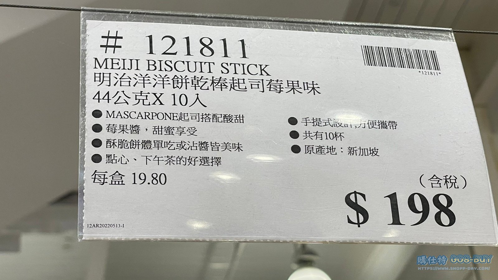 家零食&飲料新加坡零食 MEIJI明治洋洋餅乾棒起司莓果味 #121811 By 網站小編 2022 年 6 月 18 日 260 產品資訊 產品資訊 產品名稱MEIJI BISCUIT STICK 明治洋洋餅乾棒起司莓果味 44公克X10入 #121811價格198產地新加坡包裝規格44公克X10入保存期限1年備註MASCARPONE起司搭配酸甜莓果醬,甜蜜享受酥脆餅體單吃或沾醬皆美味點心、下午茶的好選擇手提設計方便攜帶共有10杯原產地:新加坡→商品問題回報← 相關 標籤MEIJI明治莓果起司餅乾餅乾棒 前一篇文章起士小金魚脆餅雙拼組合 #2013100下一篇文章NIVEA妮維雅美白身體潤膚乳液 #191447 網站小編https://shopp-day.com 或許你也感興趣 價格優惠資訊 2025好市多客製生日蛋糕價格表 價格優惠資訊 好市多Line社群加入方法 保健品&藥品 新甘木堅胃腸藥顆粒40包 #194496 購仕特-CosBuy 查詢排行 價格優惠資訊 2025好市多客製生日蛋糕價格表 價格優惠資訊 好市多Line社群加入方法 保健品&藥品 新甘木堅胃腸藥顆粒40包 #194496 價格優惠資訊 2025好市多會員護照-春季專案商品一覽表 價格優惠資訊 好市多美國牛肉整箱銷售價格表(2024/5/7) 裝載更多 熱門推薦 美國零食 科克蘭葡萄乾巧克力#959987 冷藏飲品 BLUE DIAMOND 無糖原味杏仁飲1.89L #129794 西班牙零食 MR.BROWNIE 巧克力布郎尼#153753 泰國零食 A&R牛奶巧克力迷你甜筒餅乾#1744884 比利時零食 科克蘭烈酒與波特酒巧克力 #1351451 裝載更多