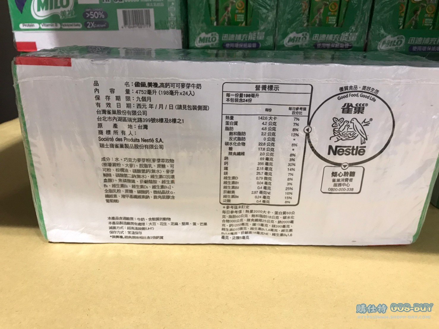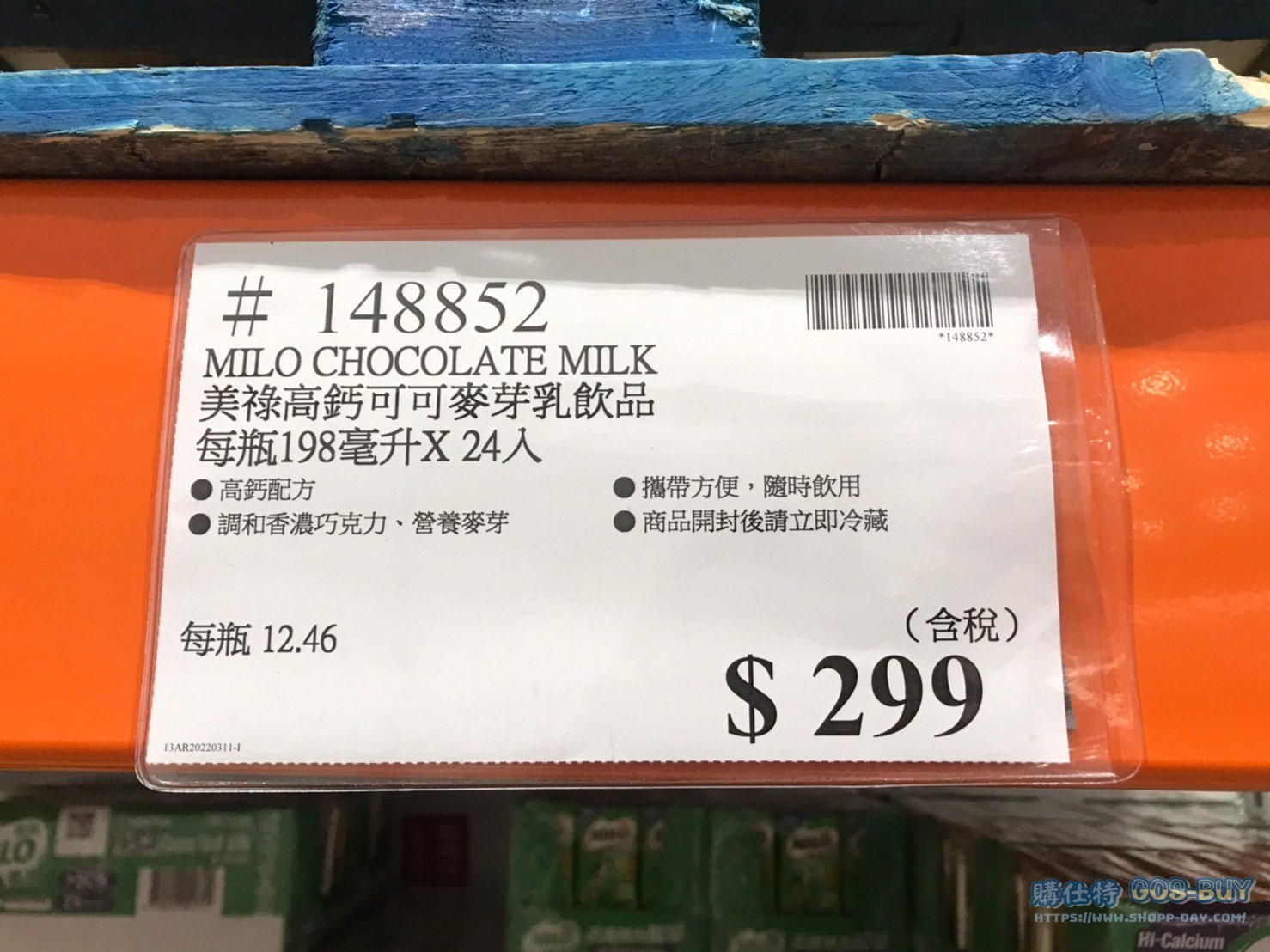 家零食&飲料 MILO CHOCOLATE MILK 美祿高鈣可可麥芽乳飲品 #148852 By 網站小編 2022 年 4 月 6 日 249 產品資訊 產品資訊 產品名稱MILO CHOCOLATE MILK 美祿高鈣可可麥芽乳飲品 每瓶198毫升 X 24入 #148852價格299產地台灣包裝規格每瓶198毫升 X 24入保存期限9個月備註高鈣配方調和香濃巧克力、營養麥芽攜帶方便,隨時飲用商品開封後請立即冷藏→商品問題回報← 相關 標籤可可牛奶美祿麥芽 前一篇文章I-MEI MILK TEA 義美厚絲絨奶茶 250毫升 X 24入 #133087下一篇文章APPLE 蘋果 IPHONE 13 128G 午夜黑 #145009 星光白 #145010 網站小編https://shopp-day.com[td_block_7 block_template_id="td_block_template_8" custom_title="大家也在找" border_color="#81d742" category_id="_current_tag"] 或許你也感興趣 價格優惠資訊 2025好市多客製生日蛋糕價格表 價格優惠資訊 好市多Line社群加入方法 保健品&藥品 新甘木堅胃腸藥顆粒40包 #194496 購仕特-CosBuy 查詢排行 價格優惠資訊 2025好市多客製生日蛋糕價格表 價格優惠資訊 好市多Line社群加入方法 保健品&藥品 新甘木堅胃腸藥顆粒40包 #194496 價格優惠資訊 2025好市多會員護照-春季專案商品一覽表 價格優惠資訊 好市多美國牛肉整箱銷售價格表(2024/5/7) 裝載更多 熱門推薦 美國零食 科克蘭葡萄乾巧克力#959987 冷藏飲品 BLUE DIAMOND 無糖原味杏仁飲1.89L #129794 西班牙零食 MR.BROWNIE 巧克力布郎尼#153753 泰國零食 A&R牛奶巧克力迷你甜筒餅乾#1744884 比利時零食 科克蘭烈酒與波特酒巧克力 #1351451 裝載更多