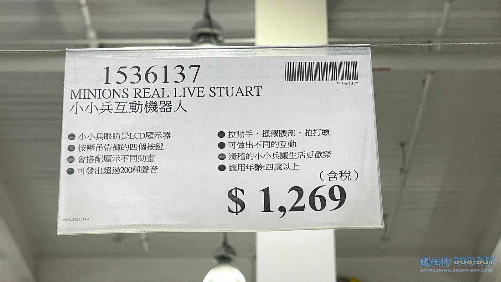 家玩具應景裝飾類小孩玩具 MINIONS REAL LIVE STUART 小小兵互動機器人 #1536137 By 網站小編 2022 年 5 月 1 日 222 產品資訊 產品資訊 產品名稱MINIONS REAL LIVE STUART 小小兵互動機器人 #1536137價格1269產地中國包裝規格一入保存期限N/A備註小小兵眼睛是LCD顯示器按壓吊帶褲的四個按鍵會搭配顯示不同動畫可發出超過200種聲音拉動手、搔癢腰部、拍打頭可做出不同的互動滑稽的小小兵讓生活更歡樂適用年齡:四歲以上→商品問題回報← 相關 標籤小孩玩具小小兵機器人 前一篇文章DWINGULER KID’S PLAYMAT 康樂遊戲地墊 #103261下一篇文章伊莎貝爾土鳳梨酥禮盒 #107102 網站小編https://shopp-day.com 或許你也感興趣 價格優惠資訊 2025好市多客製生日蛋糕價格表 價格優惠資訊 好市多Line社群加入方法 保健品&藥品 新甘木堅胃腸藥顆粒40包 #194496 購仕特-CosBuy 查詢排行 價格優惠資訊 2025好市多客製生日蛋糕價格表 價格優惠資訊 好市多Line社群加入方法 保健品&藥品 新甘木堅胃腸藥顆粒40包 #194496 價格優惠資訊 2025好市多會員護照-春季專案商品一覽表 價格優惠資訊 好市多美國牛肉整箱銷售價格表(2024/5/7) 裝載更多 熱門推薦 小孩玩具 LILFANT 雙面遊戲地墊 韓國製 #218570 應景裝飾 8FT LED NUTCRACKER 8呎LED胡桃鉗士兵 長65寬65高244公分 #1486943 應景裝飾 J’ADORE花園多肉治癒系列#139640 健身用品 PARKLON DUAL CUSHION MAT 雙層遊戲軟墊 #635029 應景裝飾 DISNEY TABLE CAROLER 米奇與米妮聖誕音樂裝飾 長31X寬20X高39公分 #1486471 裝載更多