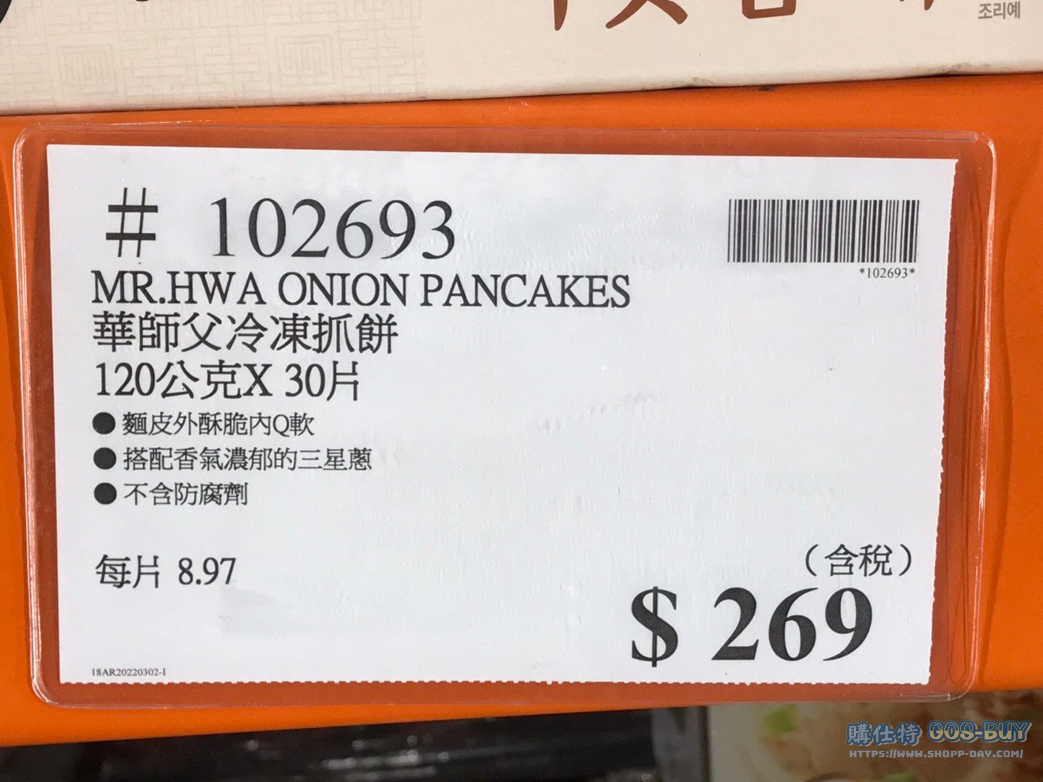 家食品麵包類冷凍食品 華師父冷凍抓餅 #102693 By 網站小編 2021 年 12 月 10 日 270 產品資訊 產品資訊 產品名稱MR.HWA FROZEN GREEN ONION ASIAN PANCAKES 華師父冷凍抓餅 120公克X30片 #102693價格269產地台灣包裝規格120公克X30片保存期限依包裝所示備註麵皮外酥脆內Q軟搭配香氣濃郁的三星蔥不含防腐劑→商品問題回報 相關 標籤抓餅華師傅蔥抓餅 前一篇文章G&M綿羊油潤膚乳霜250克5入 #128965下一篇文章科克蘭養殖超大蝦仁908G #225551 網站小編https://shopp-day.com 或許你也感興趣 價格優惠資訊 2025好市多客製生日蛋糕價格表 價格優惠資訊 好市多Line社群加入方法 保健品&藥品 新甘木堅胃腸藥顆粒40包 #194496 購仕特-CosBuy 查詢排行 價格優惠資訊 2025好市多客製生日蛋糕價格表 價格優惠資訊 好市多Line社群加入方法 保健品&藥品 新甘木堅胃腸藥顆粒40包 #194496 價格優惠資訊 2025好市多會員護照-春季專案商品一覽表 價格優惠資訊 好市多美國牛肉整箱銷售價格表(2024/5/7) 裝載更多 熱門推薦 價格優惠資訊 2025好市多客製生日蛋糕價格表 價格優惠資訊 好市多美國牛肉整箱銷售價格表(2024/5/7) 價格優惠資訊 好市多日本和牛價格表 2024.4.29更新 冷藏食品 美國特選無骨牛小排火鍋片#25737 冷藏食品 舊振南英式馬芬米福堡#143387 裝載更多