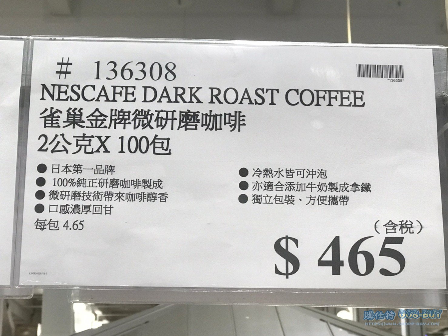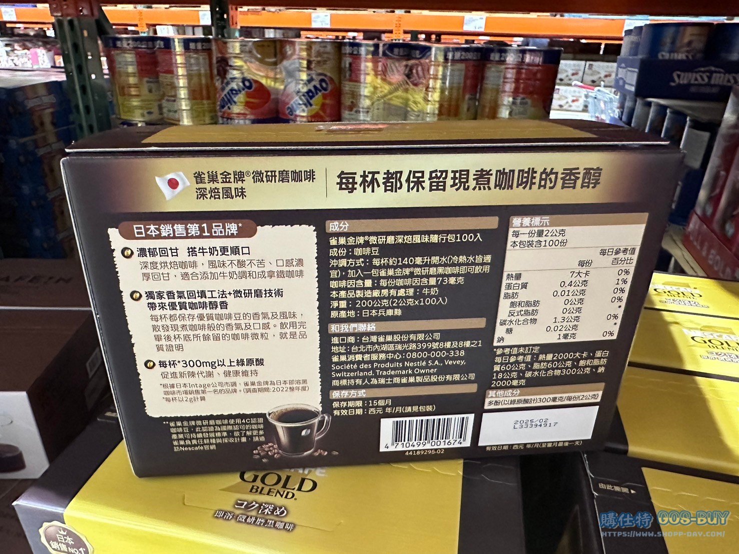 家食品麵包類咖啡製品類 NESCAFE雀巢金牌微研磨咖啡#136308 By 網站小編 2022 年 5 月 27 日 456 產品資訊 產品資訊 產品名稱 NESCAFE DARK ROAST COFFEE 雀巢金牌微研磨咖啡 2公克X100包 #136308 價格 465 產地 日本 包裝規格 2公克X100包 保存期限 15個月 備註 日本第一品牌100%純正研磨咖啡製成微研磨技術帶來咖啡醇香口感濃厚回甘老熱水皆可沖泡亦適合添加牛奶製成拿鐵獨立包裝、方便攜帶 →商品問題回報← 相關 標籤即溶咖啡咖啡包特展展示商品雀巢 前一篇文章KLIM克寧A2牛親合純生乳 #136181下一篇文章MILO 美祿巧克力麥芽飲品組 #107766 網站小編https://shopp-day.com 或許你也感興趣 價格優惠資訊 2025好市多客製生日蛋糕價格表 價格優惠資訊 好市多Line社群加入方法 保健品&藥品 新甘木堅胃腸藥顆粒40包 #194496 購仕特-CosBuy 查詢排行 價格優惠資訊 2025好市多客製生日蛋糕價格表 價格優惠資訊 好市多Line社群加入方法 保健品&藥品 新甘木堅胃腸藥顆粒40包 #194496 價格優惠資訊 2025好市多會員護照-春季專案商品一覽表 價格優惠資訊 好市多美國牛肉整箱銷售價格表(2024/5/7) 裝載更多 熱門推薦 價格優惠資訊 2025好市多客製生日蛋糕價格表 價格優惠資訊 好市多美國牛肉整箱銷售價格表(2024/5/7) 價格優惠資訊 好市多日本和牛價格表 2024.4.29更新 冷藏食品 美國特選無骨牛小排火鍋片#25737 冷藏食品 舊振南英式馬芬米福堡#143387 裝載更多