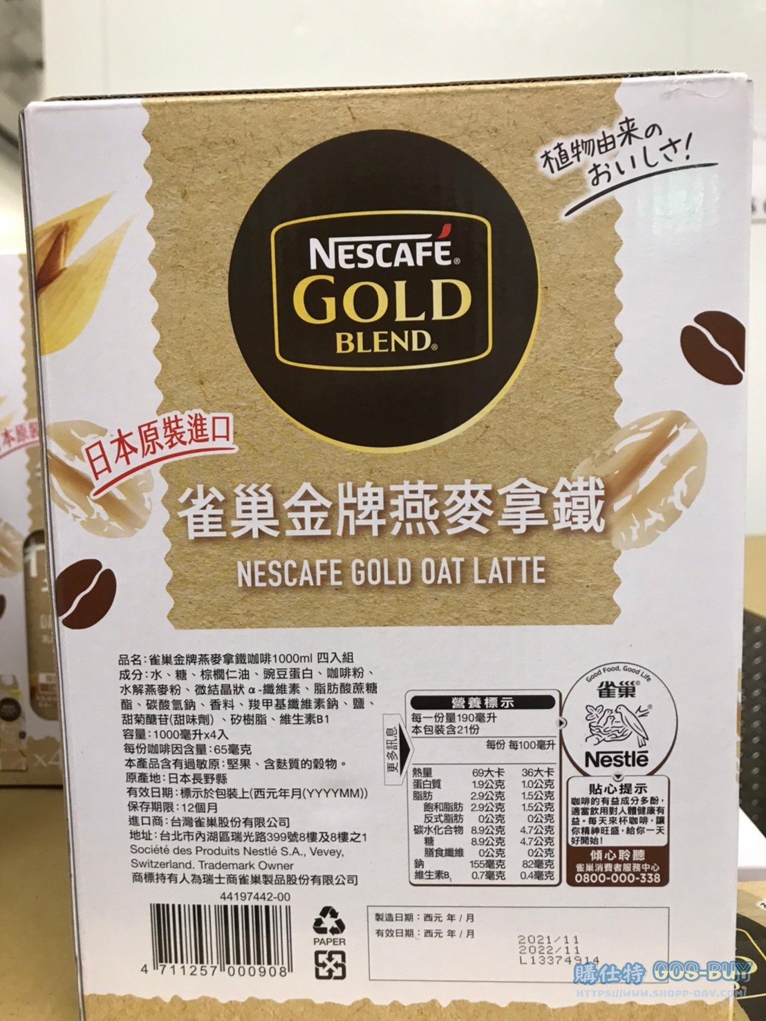 家食品麵包類咖啡製品類 NESCAFE GOLD OAT LATTE 雀巢金牌燕麥拿鐵 #369001 By 網站小編 2022 年 5 月 11 日 184 產品資訊 產品資訊 產品名稱NESCAFE GOLD OAT LATTE 雀巢金牌燕麥拿鐵 1000毫升X4入 #369001價格669產地日本包裝規格1000毫升 X 4入保存期限12個月備註植物奶做的咖啡飲品含維生素B1結合細緻的燕麥奶與咖啡口感濃郁柔順,尾韻香濃→商品問題回報← 相關 標籤拿鐵燕麥奶雀巢 前一篇文章雀巢金牌杏仁拿鐵 #369002下一篇文章A-SHA HAKKA SPICY NOODLES 阿舍食堂客家粄條-麻辣 #1460194 網站小編https://shopp-day.com 或許你也感興趣 價格優惠資訊 2025好市多客製生日蛋糕價格表 價格優惠資訊 好市多Line社群加入方法 保健品&藥品 新甘木堅胃腸藥顆粒40包 #194496 購仕特-CosBuy 查詢排行 價格優惠資訊 2025好市多客製生日蛋糕價格表 價格優惠資訊 好市多Line社群加入方法 保健品&藥品 新甘木堅胃腸藥顆粒40包 #194496 價格優惠資訊 2025好市多會員護照-春季專案商品一覽表 價格優惠資訊 好市多美國牛肉整箱銷售價格表(2024/5/7) 裝載更多 熱門推薦 價格優惠資訊 2025好市多客製生日蛋糕價格表 價格優惠資訊 好市多美國牛肉整箱銷售價格表(2024/5/7) 價格優惠資訊 好市多日本和牛價格表 2024.4.29更新 冷藏食品 美國特選無骨牛小排火鍋片#25737 冷藏食品 舊振南英式馬芬米福堡#143387 裝載更多