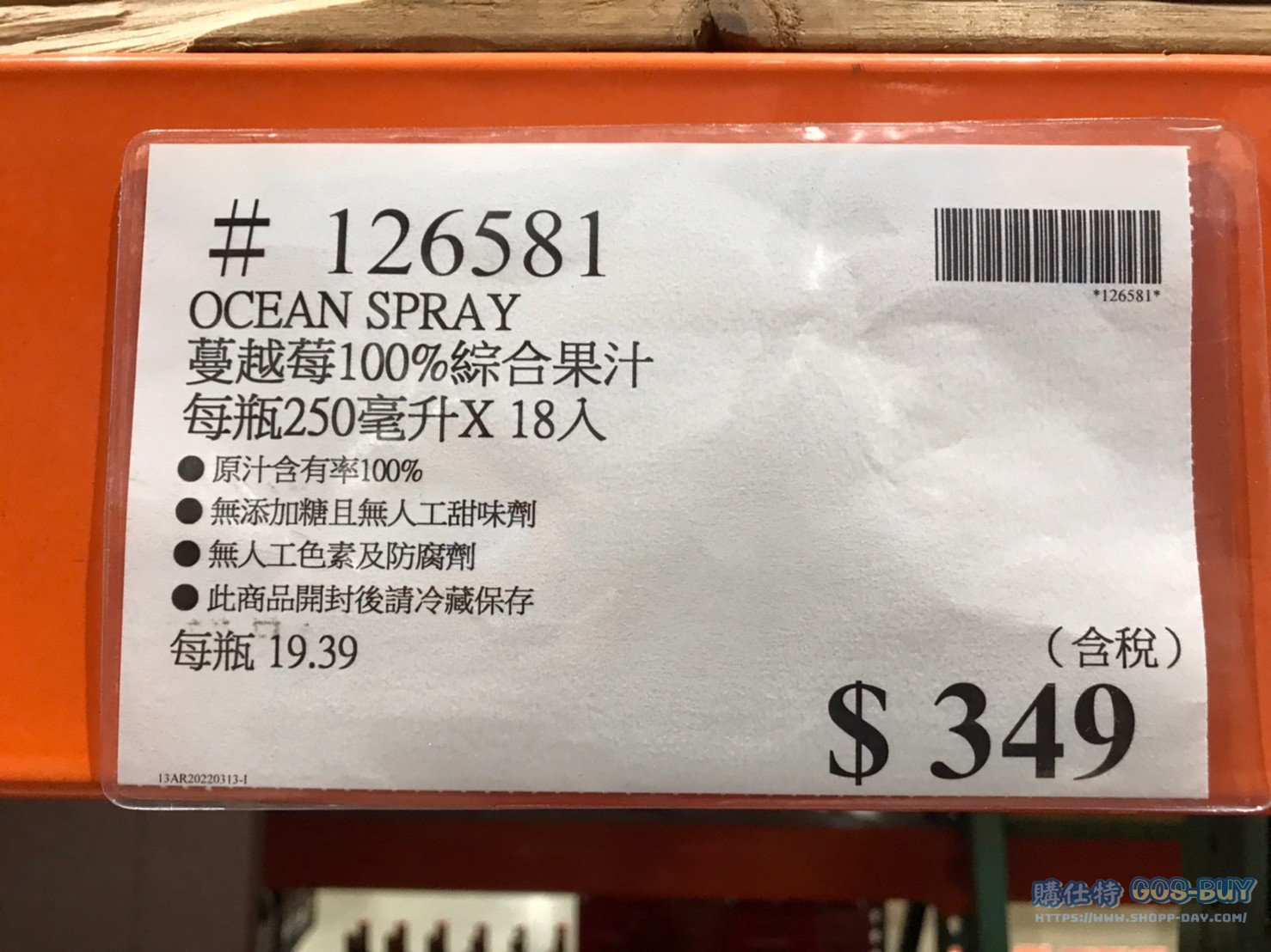 家零食&飲料 OCEAN SPRAY 蔓越莓100%綜合果汁#126581 By 網站小編 2022 年 4 月 16 日 258 產品資訊 產品資訊 產品名稱OCEAN SPRAY 蔓越莓100%綜合果汁 每瓶250毫升X18入 #126581價格349產地台灣包裝規格250毫升X18入保存期限一年備註原汁含有率100%無添加糖且無人工甜味劑無人工色素及仿腐劑此商品開封後請冷藏保存→商品問題回報← 相關 標籤果汁蔓越莓 前一篇文章激浪汽水易開罐 330毫升 X 24入 #109171下一篇文章THE LEARNING 齒輪積木恐龍/越野車 #2293002 網站小編https://shopp-day.com 或許你也感興趣 價格優惠資訊 2025好市多客製生日蛋糕價格表 價格優惠資訊 好市多Line社群加入方法 保健品&藥品 新甘木堅胃腸藥顆粒40包 #194496 購仕特-CosBuy 查詢排行 價格優惠資訊 2025好市多客製生日蛋糕價格表 價格優惠資訊 好市多Line社群加入方法 保健品&藥品 新甘木堅胃腸藥顆粒40包 #194496 價格優惠資訊 2025好市多會員護照-春季專案商品一覽表 價格優惠資訊 好市多美國牛肉整箱銷售價格表(2024/5/7) 裝載更多 熱門推薦 美國零食 科克蘭葡萄乾巧克力#959987 冷藏飲品 BLUE DIAMOND 無糖原味杏仁飲1.89L #129794 西班牙零食 MR.BROWNIE 巧克力布郎尼#153753 泰國零食 A&R牛奶巧克力迷你甜筒餅乾#1744884 比利時零食 科克蘭烈酒與波特酒巧克力 #1351451 裝載更多