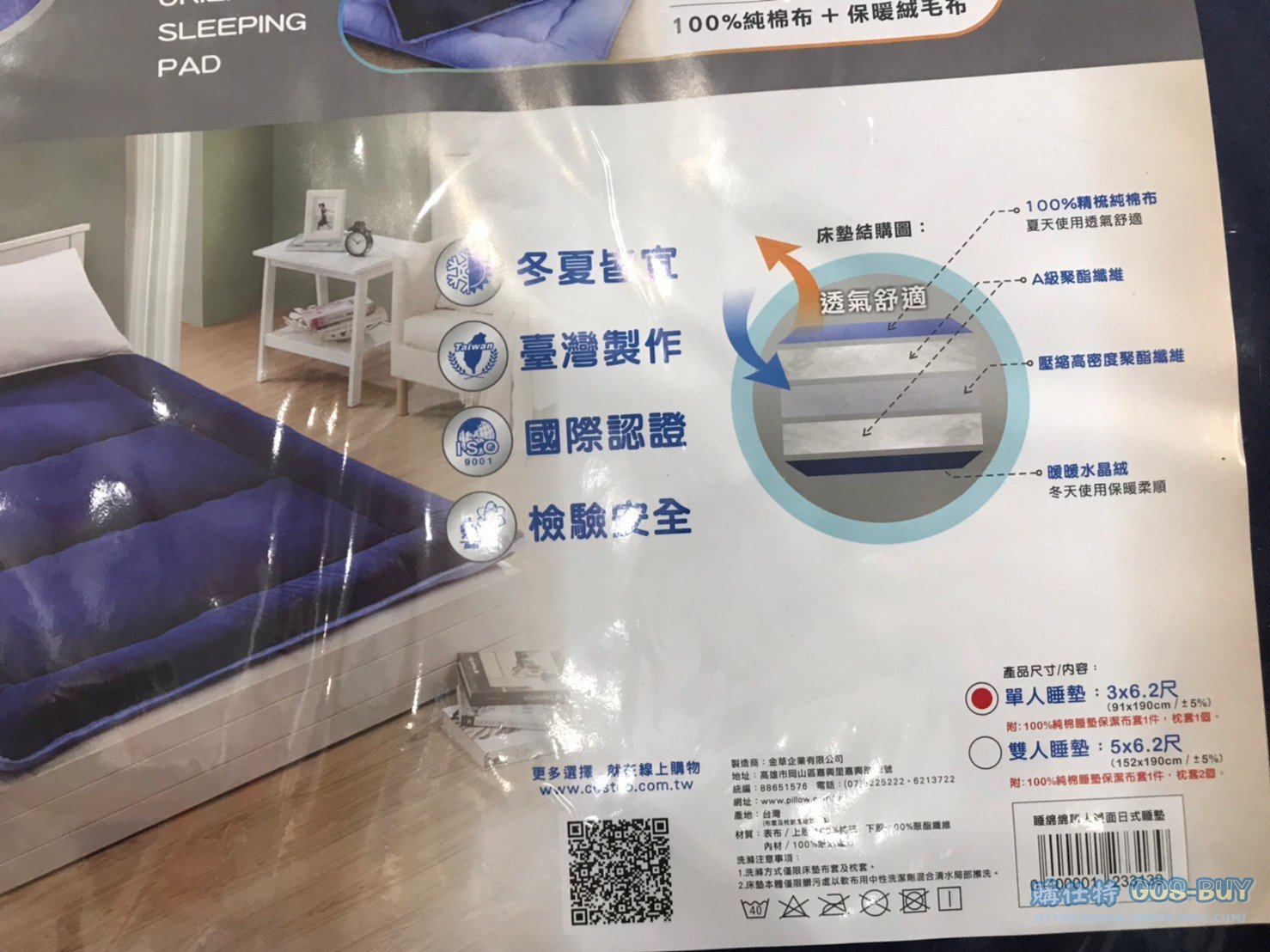 家廚房與居家生活相關寢具類 睡綿綿單人雙面日式睡墊#123313 By 網站小編 2022 年 6 月 7 日 582 產品資訊 產品資訊 產品名稱 ORIENTAL SLEEPING PAD 睡綿綿單人雙面日式睡墊 尺寸:91X190公分 #123313 價格 1469 產地 台灣 包裝規格 一入(尺寸:91X190公分) 保存期限 N/A 備註 產地:台灣一面為純棉,親膚透氣一面為水晶絨,保暖舒適可折疊方便收納附純棉床墊布套一件床墊布套:91X190附純棉枕套一件枕套:45X75公分2025/3/7查價價格由1399漲價至1469漲價70元 →商品問題回報← 相關 標籤單人床墊床墊 前一篇文章TOWN & COUNTRY LIVING浴室地墊二入組 #134655下一篇文章睡綿綿雙人雙面日式睡墊#123314 網站小編https://shopp-day.com 或許你也感興趣 價格優惠資訊 2025好市多客製生日蛋糕價格表 價格優惠資訊 好市多Line社群加入方法 保健品&藥品 新甘木堅胃腸藥顆粒40包 #194496 購仕特-CosBuy 查詢排行 價格優惠資訊 2025好市多客製生日蛋糕價格表 價格優惠資訊 好市多Line社群加入方法 保健品&藥品 新甘木堅胃腸藥顆粒40包 #194496 價格優惠資訊 2025好市多會員護照-春季專案商品一覽表 價格優惠資訊 好市多美國牛肉整箱銷售價格表(2024/5/7) 裝載更多 熱門推薦 廚房與居家生活相關 普拿疼伏冒熱飲20包 #84499 廚房與居家生活相關 DOMAINE DE LA BAUME 波姆酒莊金牌FITOU紅酒 #121971 廚房與居家生活相關 SIMON LI三人座牛皮沙發#1695608 廚房與居家生活相關 TAISHO大正胃腸藥顆粒52包 #126969 廚房與居家生活相關 IDEA NUOVA 摺疊椅 #1393843 裝載更多