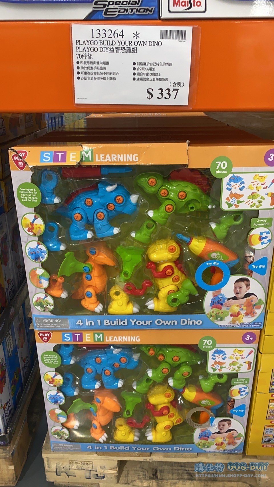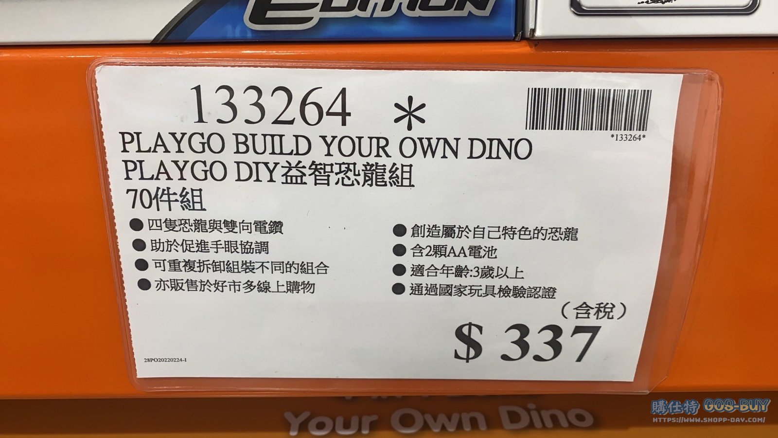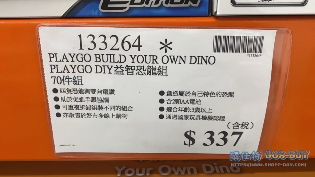 家玩具應景裝飾類小孩玩具 PLAYGO BUILD YOUR OWN DINO PALYGO DIY 益智恐龍組70件組 #133264 By 網站小編 2022 年 3 月 8 日 156 產品資訊 產品資訊 產品名稱PLAYGO BUILD YOUR OWN DINO PALYGO DIY 益智恐龍組70件組 #133264價格485(出清價:337)產地中國包裝規格70件組保存期限N/A備註四隻恐龍與雙向電鑽助於促進手眼協調可重複拆卸組裝不同的組合創造屬於自己特色的恐龍含2顆AA電池適合年齡:三歲以上通過國家玩具檢驗認證→商品問題回報← 相關 標籤恐龍益智 前一篇文章LEGO DUPLO 10914 DELUXE BRICK BOX 得寶系列豪華顆粒盒 #133342下一篇文章MEGA CITY SERVICE TEAM 高手城市服務團隊39件組 #1113945 網站小編https://shopp-day.com[td_block_7 block_template_id="td_block_template_8" custom_title="大家也在找" border_color="#81d742" category_id="_current_tag"] 或許你也感興趣 價格優惠資訊 2025好市多客製生日蛋糕價格表 價格優惠資訊 好市多Line社群加入方法 保健品&藥品 新甘木堅胃腸藥顆粒40包 #194496 購仕特-CosBuy 查詢排行 價格優惠資訊 2025好市多客製生日蛋糕價格表 價格優惠資訊 好市多Line社群加入方法 保健品&藥品 新甘木堅胃腸藥顆粒40包 #194496 價格優惠資訊 2025好市多會員護照-春季專案商品一覽表 價格優惠資訊 好市多美國牛肉整箱銷售價格表(2024/5/7) 裝載更多 熱門推薦 小孩玩具 LILFANT 雙面遊戲地墊 韓國製 #218570 應景裝飾 8FT LED NUTCRACKER 8呎LED胡桃鉗士兵 長65寬65高244公分 #1486943 應景裝飾 J’ADORE花園多肉治癒系列#139640 健身用品 PARKLON DUAL CUSHION MAT 雙層遊戲軟墊 #635029 應景裝飾 DISNEY TABLE CAROLER 米奇與米妮聖誕音樂裝飾 長31X寬20X高39公分 #1486471 裝載更多