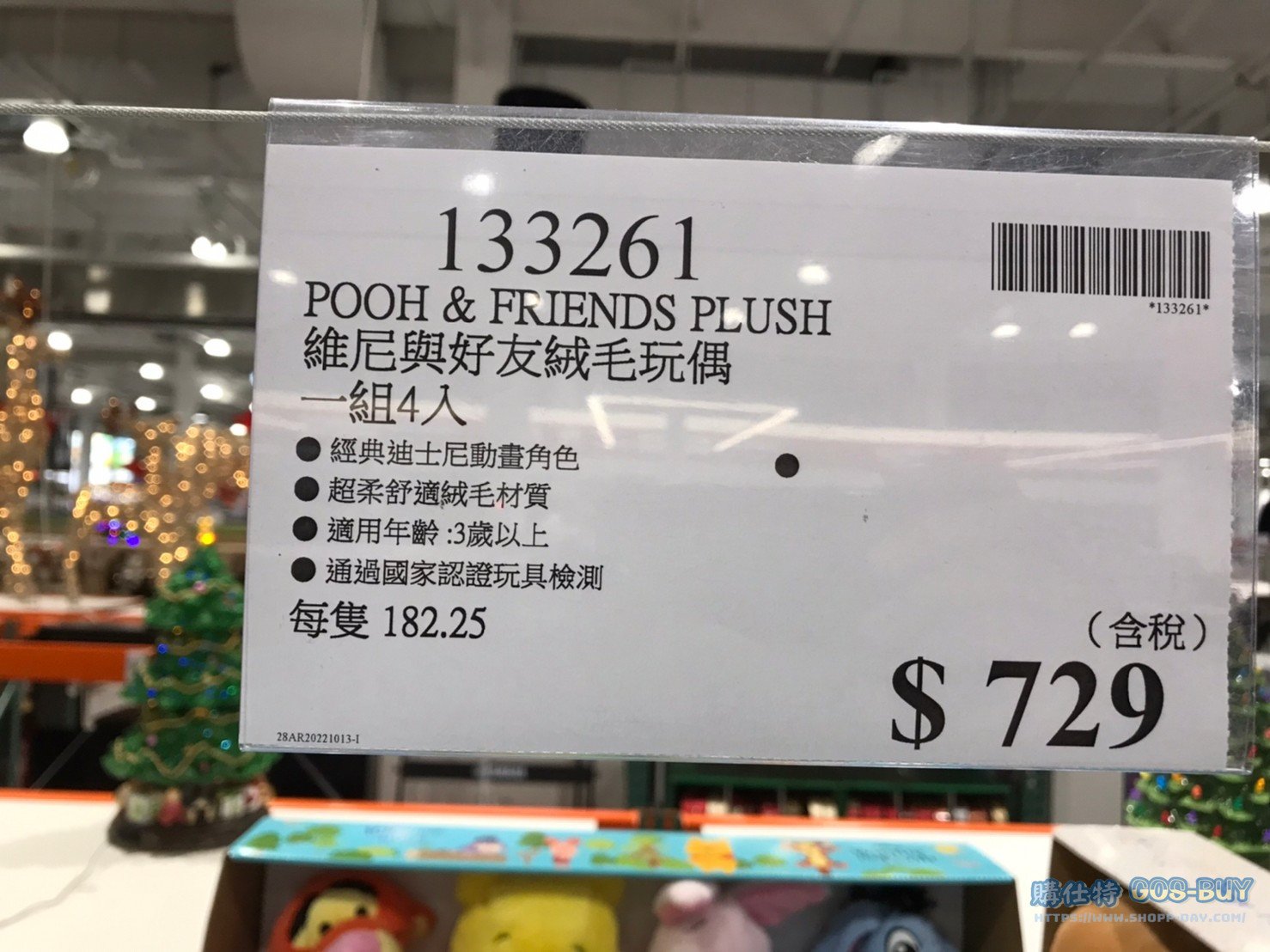家廚房與居家生活相關 POOH維尼與好友絨毛玩具一組四入 #133261 By 網站小編 2022 年 3 月 8 日 277 產品資訊 產品資訊 產品名稱POOH & FRIENDS PLUSH 維尼與好友絨毛玩具一組四入 #133261價格729產地中國包裝規格一組四入保存期限N/A備註經典迪士尼角色動畫超柔舒適絨毛材質適用年齡:三歲以上通過國家認證玩具檢測2022/10/21查價價格由739漲價為729降價10元→商品問題回報← 相關 標籤POOH小熊維尼絨毛玩具 前一篇文章小泰克經典腳行車 #132838下一篇文章HAPE SPLASH & PLAY SET 鯨魚音樂噴泉洗澡玩具組 #133248 網站小編https://shopp-day.com 或許你也感興趣 價格優惠資訊 2025好市多客製生日蛋糕價格表 價格優惠資訊 好市多Line社群加入方法 保健品&藥品 新甘木堅胃腸藥顆粒40包 #194496 購仕特-CosBuy 查詢排行 價格優惠資訊 2025好市多客製生日蛋糕價格表 價格優惠資訊 好市多Line社群加入方法 保健品&藥品 新甘木堅胃腸藥顆粒40包 #194496 價格優惠資訊 2025好市多會員護照-春季專案商品一覽表 價格優惠資訊 好市多美國牛肉整箱銷售價格表(2024/5/7) 裝載更多 熱門推薦 廚房與居家生活相關 普拿疼伏冒熱飲20包 #84499 廚房與居家生活相關 DOMAINE DE LA BAUME 波姆酒莊金牌FITOU紅酒 #121971 廚房與居家生活相關 SIMON LI三人座牛皮沙發#1695608 廚房與居家生活相關 TAISHO大正胃腸藥顆粒52包 #126969 廚房與居家生活相關 IDEA NUOVA 摺疊椅 #1393843 裝載更多