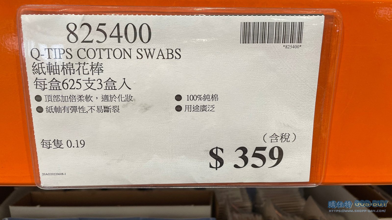 家廚房與居家生活相關 Q-TIPS紙軸棉花棒 每盒625支3盒入 #825400 By 網站小編 2022 年 3 月 16 日 294 產品資訊 產品資訊 產品名稱Q-TIPS COTTON SWABS 紙軸棉花棒 每盒625支3盒入 #825400價格359產地美國包裝規格625支3盒入保存期限N/A備註100% 純棉製成,尖頭部份為更柔軟紙軸有彈性,不易斷裂 適合全家及新生兒使用 可用於化妝/卸妝或指甲修飾 丟棄後易分解較環保2022/6/10查價價格由329漲價為359漲價30元→商品問題回報← 相關 標籤棉花棒 前一篇文章潘婷洗髮精迷迭香檸檬 #1559159下一篇文章美舒律蒸氣眼罩 共36片 #313809 網站小編https://shopp-day.com 或許你也感興趣 價格優惠資訊 2025好市多客製生日蛋糕價格表 價格優惠資訊 好市多Line社群加入方法 保健品&藥品 新甘木堅胃腸藥顆粒40包 #194496 購仕特-CosBuy 查詢排行 價格優惠資訊 2025好市多客製生日蛋糕價格表 價格優惠資訊 好市多Line社群加入方法 保健品&藥品 新甘木堅胃腸藥顆粒40包 #194496 價格優惠資訊 2025好市多會員護照-春季專案商品一覽表 價格優惠資訊 好市多美國牛肉整箱銷售價格表(2024/5/7) 裝載更多 熱門推薦 廚房與居家生活相關 普拿疼伏冒熱飲20包 #84499 廚房與居家生活相關 DOMAINE DE LA BAUME 波姆酒莊金牌FITOU紅酒 #121971 廚房與居家生活相關 SIMON LI三人座牛皮沙發#1695608 廚房與居家生活相關 TAISHO大正胃腸藥顆粒52包 #126969 廚房與居家生活相關 IDEA NUOVA 摺疊椅 #1393843 裝載更多