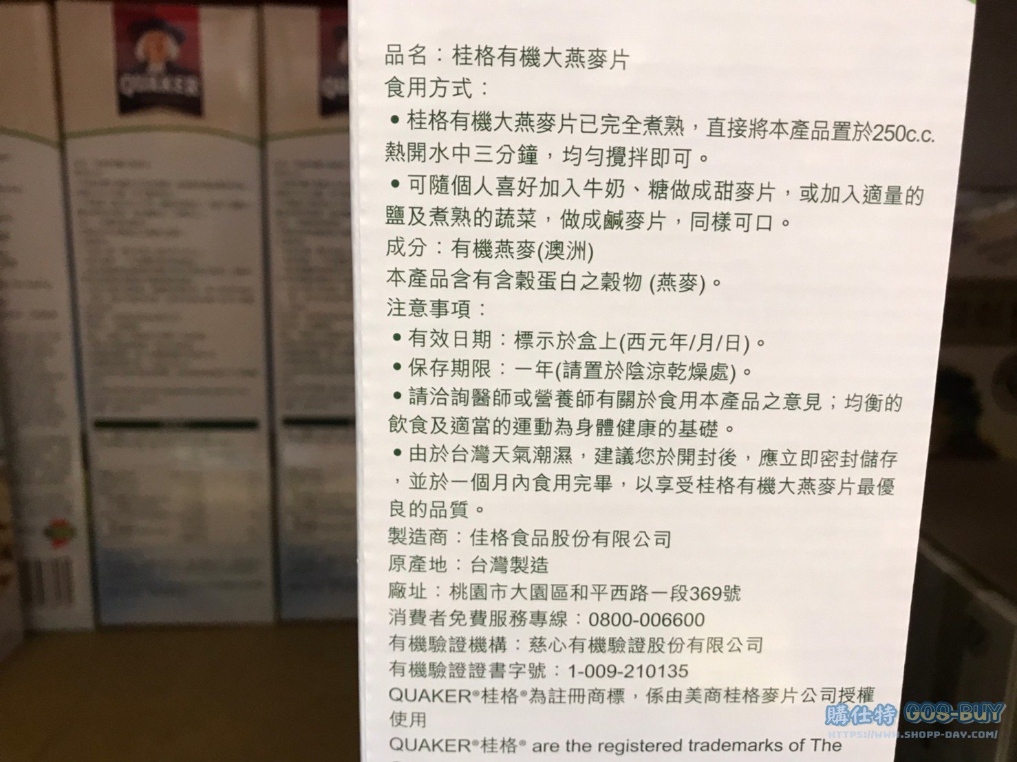 家食品麵包類即溶現泡類 QUAKER桂格有機大燕麥片 #116958 By 網站小編 2022 年 2 月 2 日 177 產品資訊 產品資訊 產品名稱QUAKER ORGANIC WHOLE OAT 桂格有機大燕麥片 每包935公克X2包入 #116958價格379產地台灣包裝規格935公克 X 2包保存期限18個月備註採用澳洲進口有機燕麥澳洲NASAA有機認證原料據台灣慈心有機TOC驗證整顆燕麥不經切割碾壓製成即食燕麥、熱水沖泡三分鐘無添加人工香精、糊精請密封保存於陰涼乾燥處 →商品問題回報← 相關 標籤有機桂格燕麥 前一篇文章QUAKER 無添加糖黃金蕎麥多穀飲 #101776下一篇文章桂格即食大燕麥片隨身包#104989 網站小編https://shopp-day.com 或許你也感興趣 價格優惠資訊 2025好市多客製生日蛋糕價格表 價格優惠資訊 好市多Line社群加入方法 保健品&藥品 新甘木堅胃腸藥顆粒40包 #194496 購仕特-CosBuy 查詢排行 價格優惠資訊 2025好市多客製生日蛋糕價格表 價格優惠資訊 好市多Line社群加入方法 保健品&藥品 新甘木堅胃腸藥顆粒40包 #194496 價格優惠資訊 2025好市多會員護照-春季專案商品一覽表 價格優惠資訊 好市多美國牛肉整箱銷售價格表(2024/5/7) 裝載更多 熱門推薦 價格優惠資訊 2025好市多客製生日蛋糕價格表 價格優惠資訊 好市多美國牛肉整箱銷售價格表(2024/5/7) 價格優惠資訊 好市多日本和牛價格表 2024.4.29更新 冷藏食品 美國特選無骨牛小排火鍋片#25737 冷藏食品 舊振南英式馬芬米福堡#143387 裝載更多