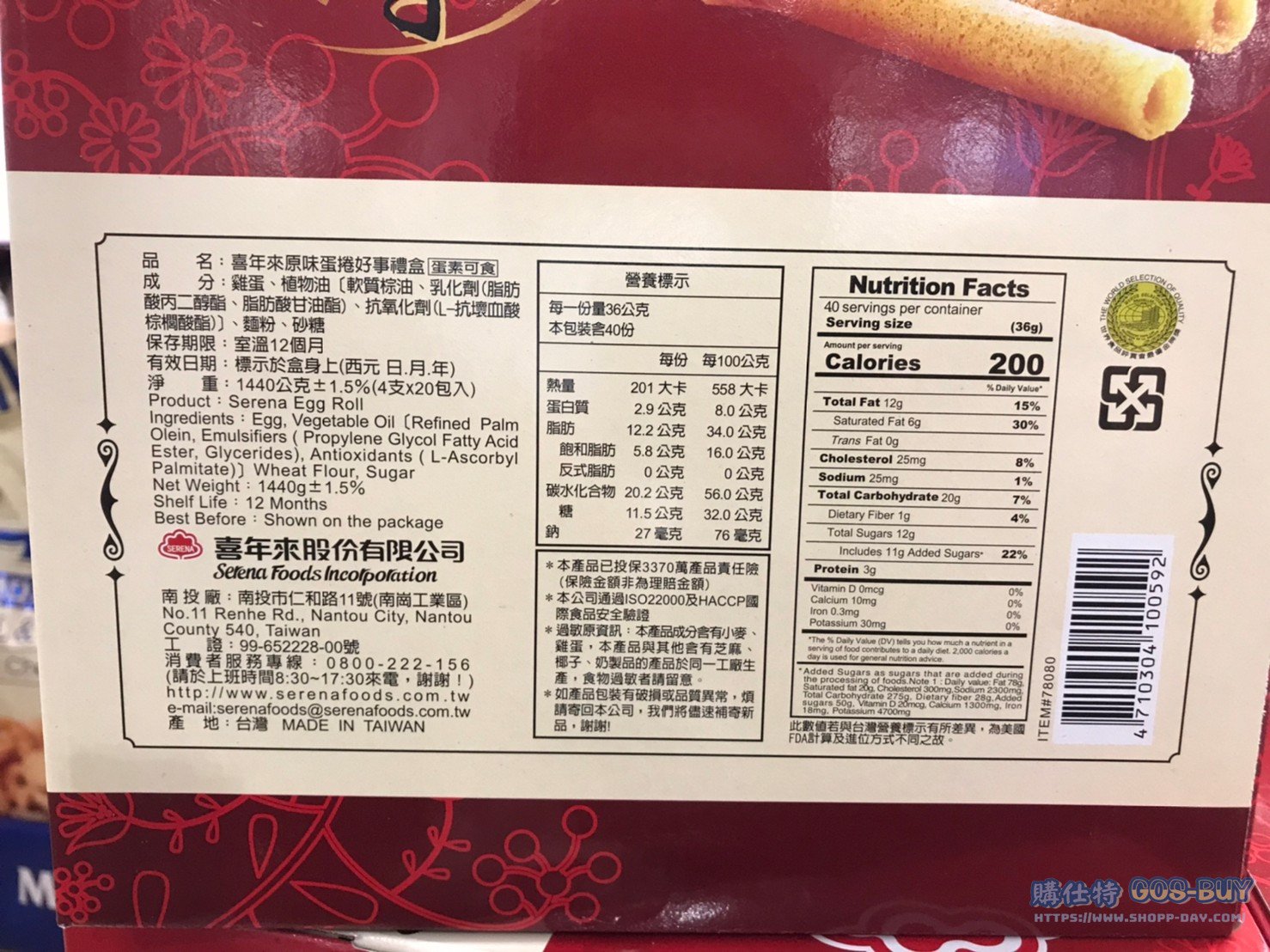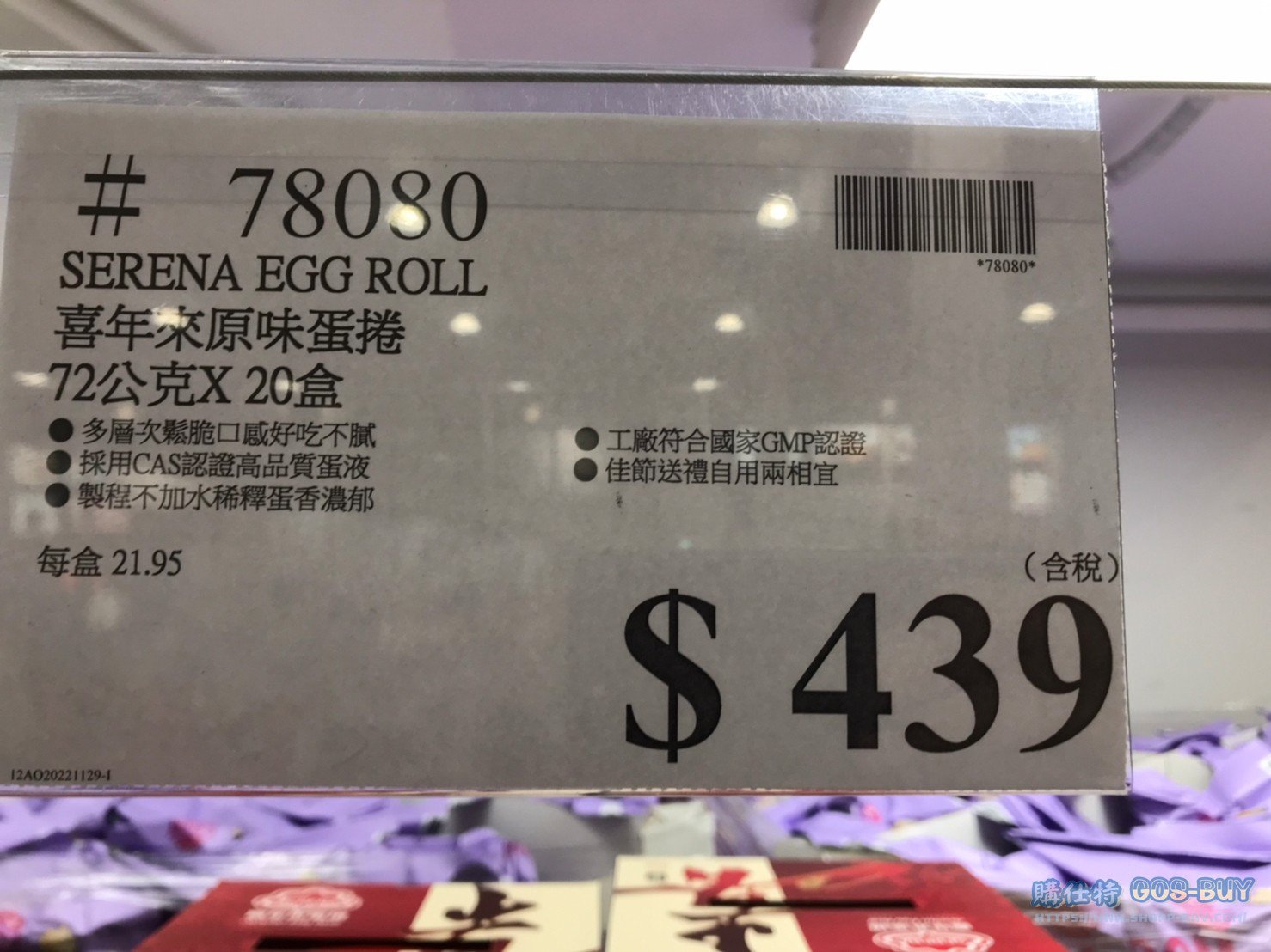 家零食&飲料台灣零食 喜年來原味蛋捲#78080 By 網站小編 2022 年 6 月 1 日 334 產品資訊 產品資訊 產品名稱 SERENA EGG ROLL 喜年來原味蛋捲 72公克X20盒 #78080 價格 439 產地 台灣 包裝規格 72公克X20盒 保存期限 12個月 備註 多層次鬆脆口感好吃不膩採用CAS認證高品質蛋液製程不加水稀釋蛋香濃郁工廠符合國家GMP認證佳節送禮自用兩相宜2022/12/5查價價格由429漲價為439漲價10元 →商品問題回報← 相關 標籤喜年來蛋捲 前一篇文章AMOS超輕黏土多色組合 #134972下一篇文章NESTLE雀巢小熊造型全穀穀片 #136182 網站小編https://shopp-day.com 或許你也感興趣 價格優惠資訊 2025好市多客製生日蛋糕價格表 價格優惠資訊 好市多Line社群加入方法 保健品&藥品 新甘木堅胃腸藥顆粒40包 #194496 購仕特-CosBuy 查詢排行 價格優惠資訊 2025好市多客製生日蛋糕價格表 價格優惠資訊 好市多Line社群加入方法 保健品&藥品 新甘木堅胃腸藥顆粒40包 #194496 價格優惠資訊 2025好市多會員護照-春季專案商品一覽表 價格優惠資訊 好市多美國牛肉整箱銷售價格表(2024/5/7) 裝載更多 熱門推薦 美國零食 科克蘭葡萄乾巧克力#959987 冷藏飲品 BLUE DIAMOND 無糖原味杏仁飲1.89L #129794 西班牙零食 MR.BROWNIE 巧克力布郎尼#153753 泰國零食 A&R牛奶巧克力迷你甜筒餅乾#1744884 比利時零食 科克蘭烈酒與波特酒巧克力 #1351451 裝載更多