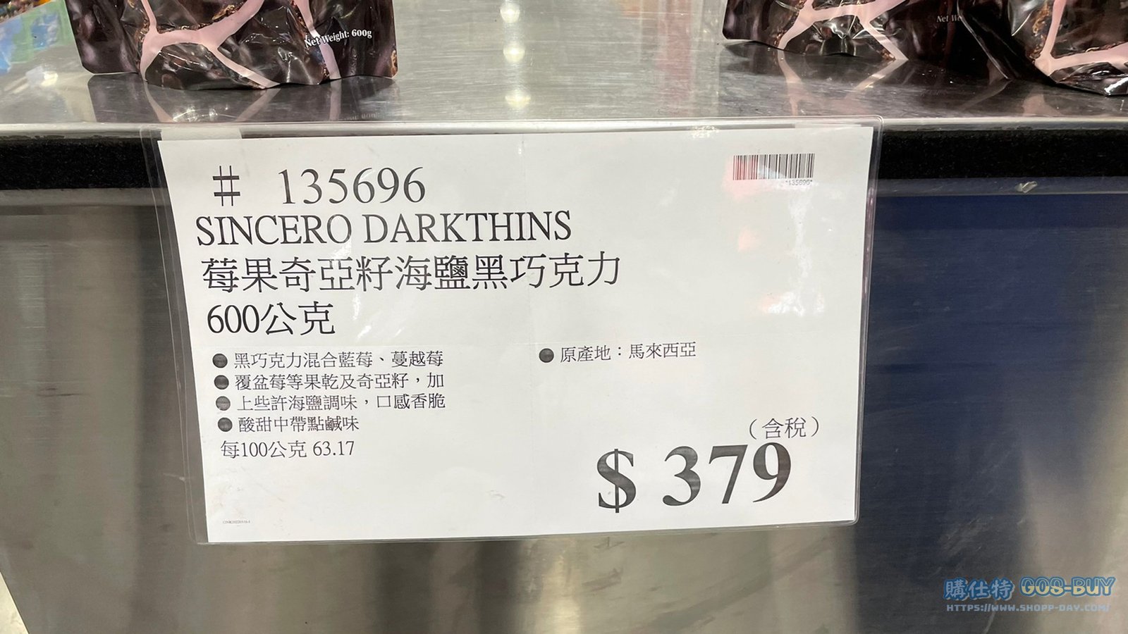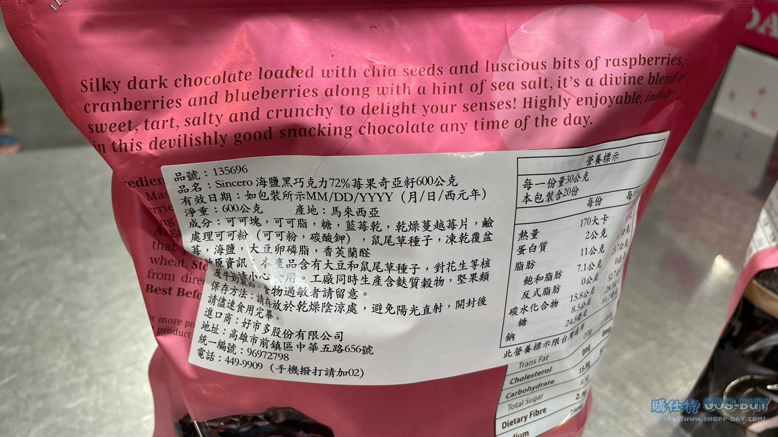 家零食&飲料 SINCERO DARKTHINS 莓果奇亞籽海鹽黑巧克力600公克 #135696 By 網站小編 2022 年 5 月 31 日 540 產品資訊 產品資訊 產品名稱SINCERO DARKTHINS 莓果奇亞籽海鹽黑巧克力600公克 #135696價格379產地馬來西亞包裝規格600公克保存期限依包裝所示備註黑巧克力混合藍莓、蔓越莓覆盆莓等果乾及奇亞籽加上些許海鹽調味,口感香脆酸甜中帶點鹹味原產地:馬來西亞→商品問題回報← 相關 標籤奇亞籽莓果黑巧克力 前一篇文章仿石雕摩艾像 長47X寬51X高100.5CM #965475下一篇文章DOVE 多芬敏弱肌溫和沐浴乳 #1571145 網站小編https://shopp-day.com 或許你也感興趣 價格優惠資訊 2025好市多客製生日蛋糕價格表 價格優惠資訊 好市多Line社群加入方法 保健品&藥品 新甘木堅胃腸藥顆粒40包 #194496 購仕特-CosBuy 查詢排行 價格優惠資訊 2025好市多客製生日蛋糕價格表 價格優惠資訊 好市多Line社群加入方法 保健品&藥品 新甘木堅胃腸藥顆粒40包 #194496 價格優惠資訊 2025好市多會員護照-春季專案商品一覽表 價格優惠資訊 好市多美國牛肉整箱銷售價格表(2024/5/7) 裝載更多 熱門推薦 美國零食 科克蘭葡萄乾巧克力#959987 冷藏飲品 BLUE DIAMOND 無糖原味杏仁飲1.89L #129794 西班牙零食 MR.BROWNIE 巧克力布郎尼#153753 泰國零食 A&R牛奶巧克力迷你甜筒餅乾#1744884 比利時零食 科克蘭烈酒與波特酒巧克力 #1351451 裝載更多