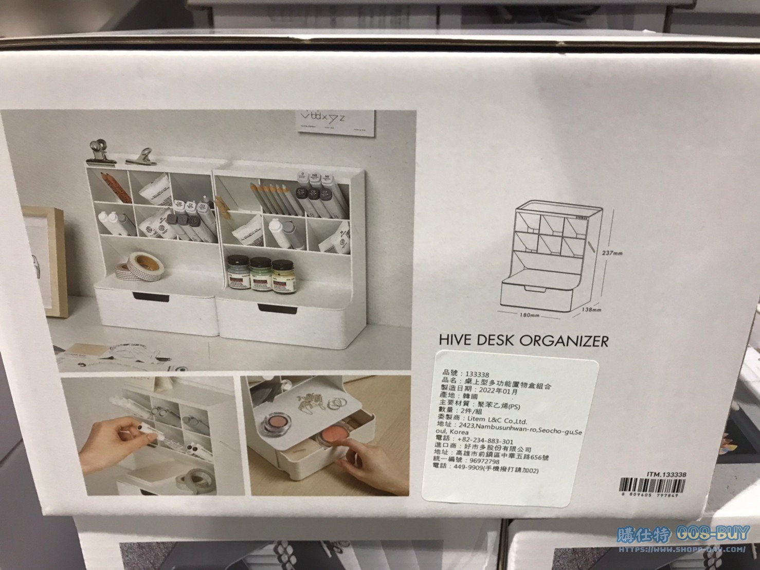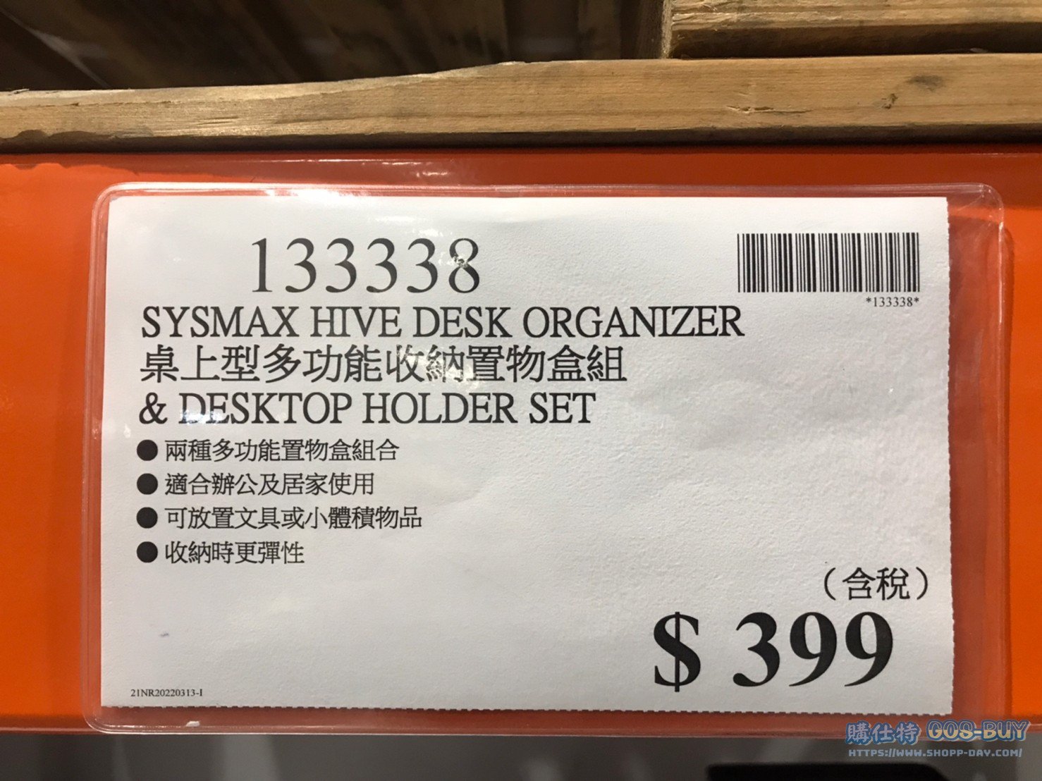 家廚房與居家生活相關 SYSMAX HIVE DESK ORGANIZER 桌上型多功能收納置物盒組 #133338 By 網站小編 2022 年 4 月 15 日 312 產品資訊 產品資訊 產品名稱 SYSMAX HIVE DESK ORGANIZER 桌上型多功能收納置物盒組 &DESKTOP HOLDER SET #133338 價格 399 產地 韓國 包裝規格 一入(共兩色可選) 保存期限 N/A 備註 兩種多功能置物盒組合適合辦公及居家使用可放置文具或小體積物品收納時更彈性共兩色可選 灰色、白色 →商品問題回報← 相關 標籤SYSMAX收納盒 前一篇文章TOPS PERF PADS 100S 9PK 進口100頁記事本9入 (INCH) #233322下一篇文章PHILIPS AIRFRYER 飛利浦氣炸鍋 #HD9742 #139742 網站小編https://shopp-day.com 或許你也感興趣 價格優惠資訊 2025好市多客製生日蛋糕價格表 價格優惠資訊 好市多Line社群加入方法 保健品&藥品 新甘木堅胃腸藥顆粒40包 #194496 購仕特-CosBuy 查詢排行 價格優惠資訊 2025好市多客製生日蛋糕價格表 價格優惠資訊 好市多Line社群加入方法 保健品&藥品 新甘木堅胃腸藥顆粒40包 #194496 價格優惠資訊 2025好市多會員護照-春季專案商品一覽表 價格優惠資訊 好市多美國牛肉整箱銷售價格表(2024/5/7) 裝載更多 熱門推薦 廚房與居家生活相關 普拿疼伏冒熱飲20包 #84499 廚房與居家生活相關 DOMAINE DE LA BAUME 波姆酒莊金牌FITOU紅酒 #121971 廚房與居家生活相關 SIMON LI三人座牛皮沙發#1695608 廚房與居家生活相關 TAISHO大正胃腸藥顆粒52包 #126969 廚房與居家生活相關 IDEA NUOVA 摺疊椅 #1393843 裝載更多
