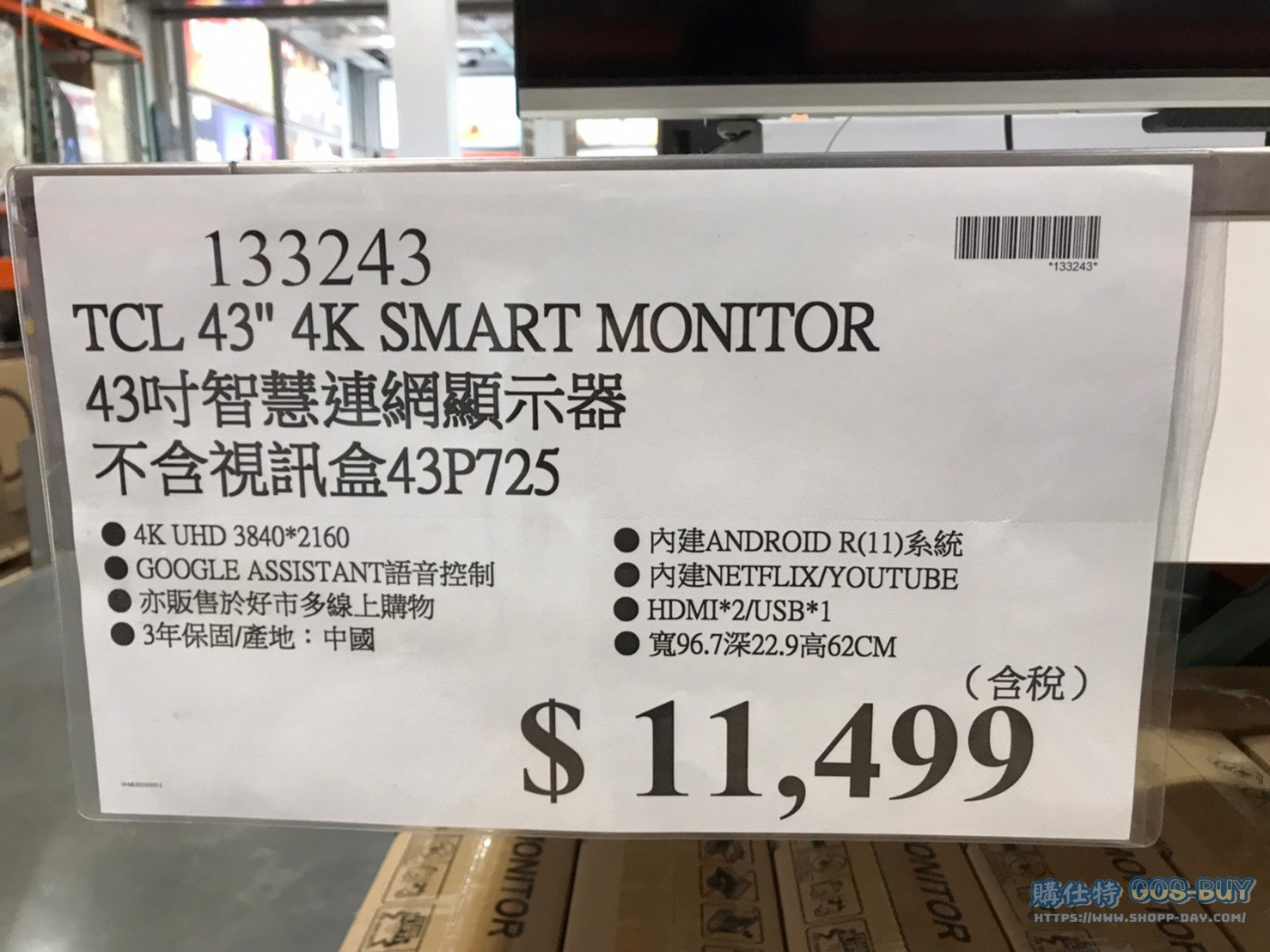 | 產品名稱 | TCL 43″ 4K SMART MONITOR 43吋智慧連網顯示器 不含視訊盒 43P725 #133243 |