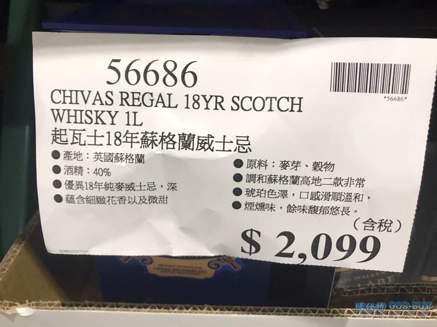 家酒品類威士忌 起瓦士18年蘇格蘭威士忌 1L #56686 By 網站小編 2022 年 3 月 13 日 1673 產品資訊 產品資訊 產品名稱THE CHIVAS REGAL 18YR SCOTCH WHISKY 起瓦士18年蘇格蘭威士忌 1L #56686價格2099產地英國包裝規格1L保存期限N/A備註2016舊金山世界烈酒大賽-金牌 產地:英國蘇格蘭 原料:麥芽、穀物 酒精:40% 調和蘇格蘭高地二款 非常優異 18 年純麥威士忌, 深琥珀色澤,口感滑順溫和,蘊含細緻花香以及微甜煙燻味,餘味馥郁悠長。 2022/7/25查價價格由1999漲價為2099漲價100元→商品問題回報← 相關 標籤威士忌 前一篇文章AFTERSHOKZ OPENCOMM HEADPHONE 骨傳導藍芽通訊耳機 ASC100 #132053下一篇文章PIXAR PLUSH SET 2PK PIXAR絨毛玩偶2入 #133262 網站小編https://shopp-day.com 或許你也感興趣 價格優惠資訊 2025好市多客製生日蛋糕價格表 價格優惠資訊 好市多Line社群加入方法 保健品&藥品 新甘木堅胃腸藥顆粒40包 #194496 購仕特-CosBuy 查詢排行 價格優惠資訊 2025好市多客製生日蛋糕價格表 價格優惠資訊 好市多Line社群加入方法 保健品&藥品 新甘木堅胃腸藥顆粒40包 #194496 價格優惠資訊 2025好市多會員護照-春季專案商品一覽表 價格優惠資訊 好市多美國牛肉整箱銷售價格表(2024/5/7) 裝載更多 熱門推薦 其他酒類 日本芒果梅酒#143982 威士忌 KAVALAN噶瑪蘭調酒師精選威士忌#129555 葡萄酒 1865 卡貝納蘇維翁紅酒750ML 2019/2020 #113198 葡萄酒 波姆酒莊琥珀金牌紅酒#125623 威士忌 KAVAKAN 噶瑪蘭威士忌酒展商品一覽表 裝載更多