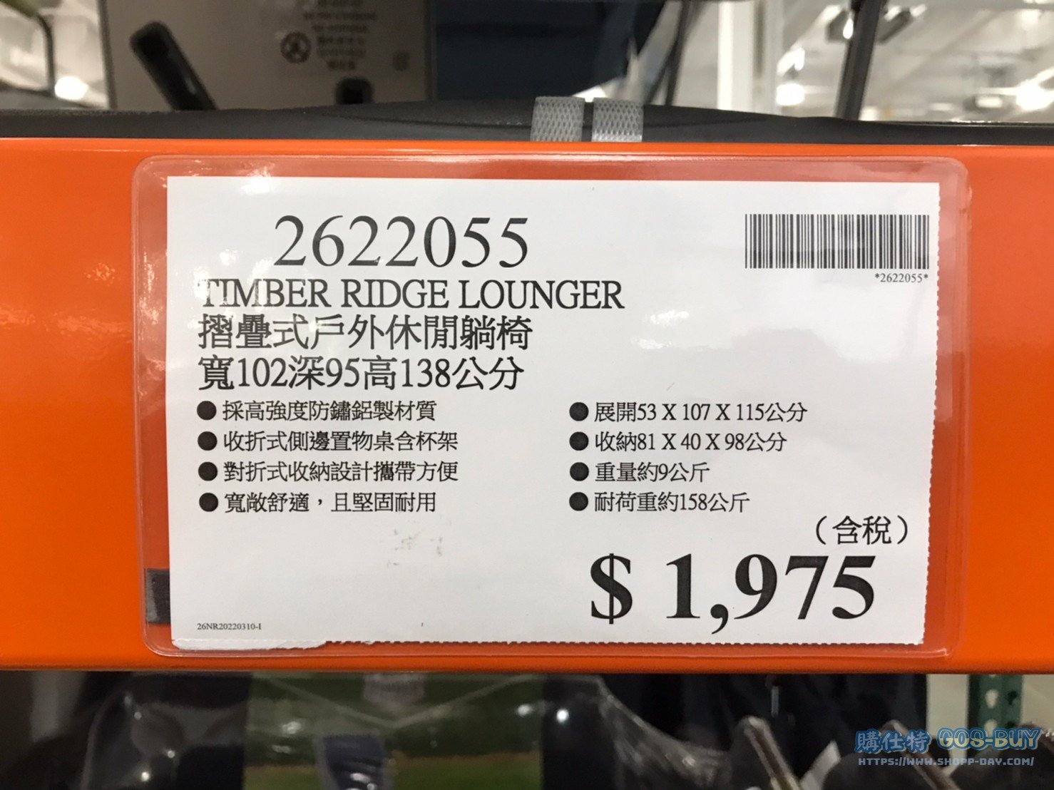 家廚房與居家生活相關桌子椅子 TIMBER RIDGE LOUNGER 摺疊式戶外休閒躺椅 #2622055 By 網站小編 2022 年 4 月 6 日 542 產品資訊 產品資訊 產品名稱TIMBER RIDGE LOUNGER 摺疊式戶外休閒躺椅 寬102深95高138公分 #2622055價格1975產地中國包裝規格一入保存期限N/A備註採高強度防鏽鋁製材質收折式側邊置物桌含杯架對折式收納設計攜帶方便寬敞舒適,且堅固耐用展開:53 X 107 X 115公分收納:81 X 40 X 98公分重量約9公斤耐荷重約158公斤→商品問題回報← 相關 標籤TIMBER摺疊椅 前一篇文章TIMBER RIDGE CAPTAIN CHAIR 便攜式摺疊露營椅 #1327341下一篇文章CASCADE MOUNTAIN TECH ULTRALIGHT CHAIR 鋁製輕量高背隨行椅 #2622037 網站小編https://shopp-day.com 或許你也感興趣 價格優惠資訊 2025好市多客製生日蛋糕價格表 價格優惠資訊 好市多Line社群加入方法 保健品&藥品 新甘木堅胃腸藥顆粒40包 #194496 購仕特-CosBuy 查詢排行 價格優惠資訊 2025好市多客製生日蛋糕價格表 價格優惠資訊 好市多Line社群加入方法 保健品&藥品 新甘木堅胃腸藥顆粒40包 #194496 價格優惠資訊 2025好市多會員護照-春季專案商品一覽表 價格優惠資訊 好市多美國牛肉整箱銷售價格表(2024/5/7) 裝載更多 熱門推薦 廚房與居家生活相關 SIMON LI三人座牛皮沙發#1695608 戶外用品 12*16′ TARPS 2 PACK 多功能雙色帆布2入#1600091 廚房與居家生活相關 IDEA NUOVA 摺疊椅 #1393843 園藝相關 好市多花束價格 #111590 #136064 #117849 #28013 旅行用品類 SAMSONITE 22+29吋行李箱二入組#140918 裝載更多