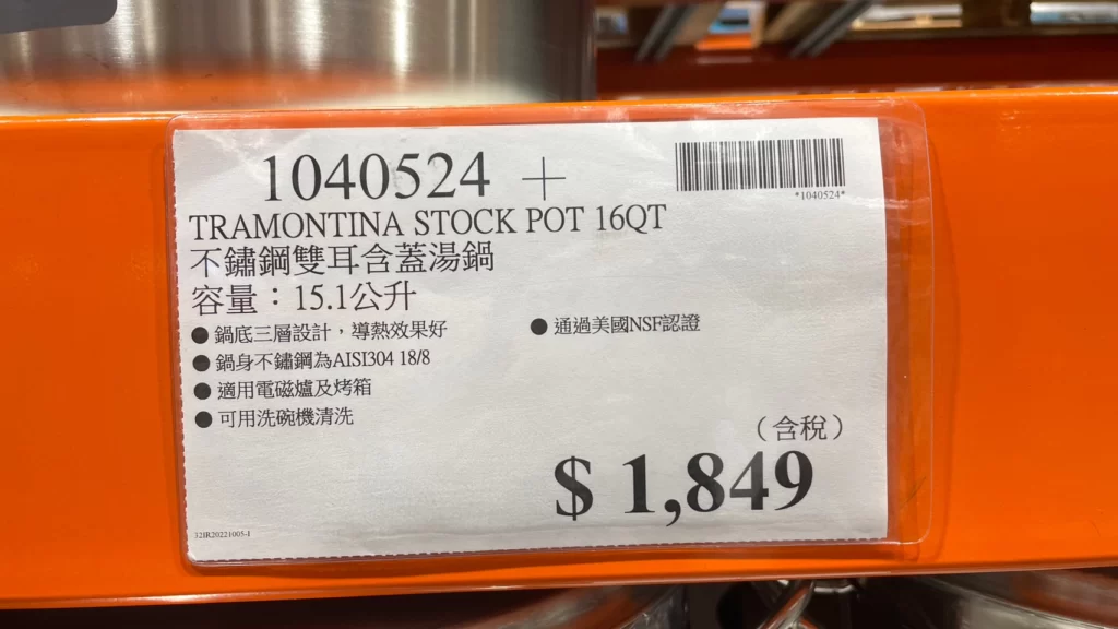 家廚房與居家生活相關 TRAMONTINA 不鏽鋼雙耳含蓋湯鍋 #1040524 By 網站小編 2022 年 8 月 17 日 360 產品資訊 產品資訊 產品名稱TRAMONTINA STOCK POT 16QT 不鏽鋼雙耳含蓋湯鍋 容量:15.1公升 #1040524價格1849產地中國包裝規格一組(容量:15.1公升 )保存期限N/A備註鍋底三層設計,導熱效果好鍋身不鏽鋼為AISI304 18/8適用電磁爐及烤箱可用洗碗機清洗通過美國NSF認證2022/10/08查價價格由1699漲價為1849漲價150元→商品問題回報← 相關 標籤TRAMONTINA不鏽鋼湯鍋 前一篇文章TOMMY BAHAMA 男編織休閒腰帶 尺寸:S/M-L/XL #1372645下一篇文章TCL 65″4K 智慧聯網顯示器 #135365 網站小編https://shopp-day.com 或許你也感興趣 價格優惠資訊 2025好市多客製生日蛋糕價格表 價格優惠資訊 好市多Line社群加入方法 保健品&藥品 新甘木堅胃腸藥顆粒40包 #194496 購仕特-CosBuy 查詢排行 價格優惠資訊 2025好市多客製生日蛋糕價格表 價格優惠資訊 好市多Line社群加入方法 保健品&藥品 新甘木堅胃腸藥顆粒40包 #194496 價格優惠資訊 2025好市多會員護照-春季專案商品一覽表 價格優惠資訊 好市多美國牛肉整箱銷售價格表(2024/5/7) 裝載更多 熱門推薦 廚房與居家生活相關 普拿疼伏冒熱飲20包 #84499 廚房與居家生活相關 DOMAINE DE LA BAUME 波姆酒莊金牌FITOU紅酒 #121971 廚房與居家生活相關 SIMON LI三人座牛皮沙發#1695608 廚房與居家生活相關 TAISHO大正胃腸藥顆粒52包 #126969 廚房與居家生活相關 IDEA NUOVA 摺疊椅 #1393843 裝載更多