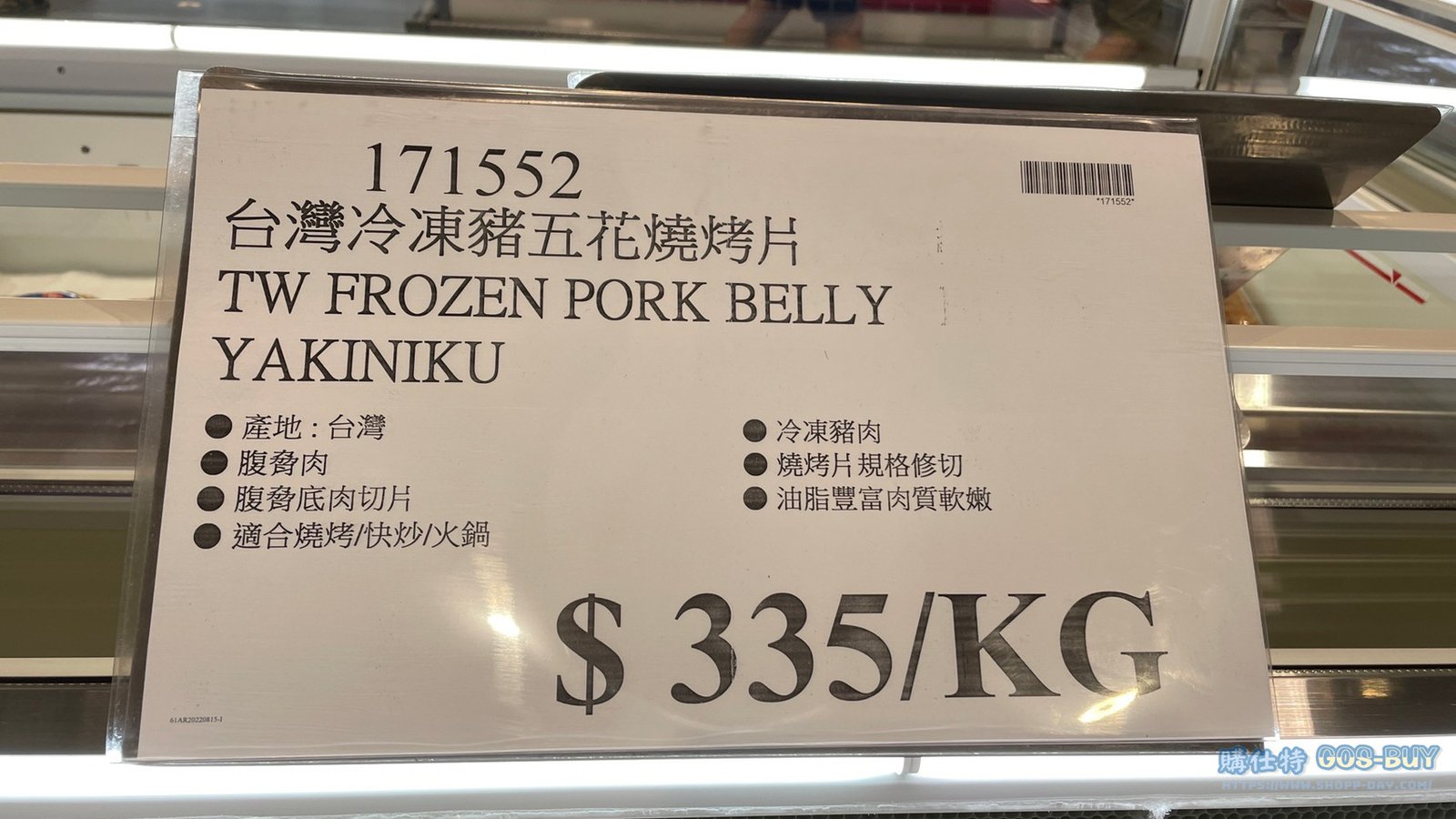 家食品麵包類冷凍食品 台灣五花肉切花燒烤片 #171552 By 網站小編 2021 年 12 月 13 日 335 產品資訊 產品資訊 產品名稱TW FROZEN PORK BELLY YAKINIKU 台灣五花肉切花燒烤片 #171552價格335/KG (價格僅供參考 會因時價隨時變動)產地台灣包裝規格依包裝所示保存期限依包裝所示備註腹脅肉腹脅底肉切片燒烤片規格修切油脂豐富肉質軟嫩適合燒烤 快炒 火鍋2022/5/22 由價格299/KG 漲價為319/KG 漲價20/KG元2022/8/19查價價格319/KG漲價為335/KG漲價16/KG元→商品問題回報← 相關 標籤台灣豬燒烤肉片豬五花豬肉 前一篇文章科克蘭養殖大蝦仁908G #777001下一篇文章TW PORK BELLY YAKINIKU 台灣五花肉切花燒烤片 #123805 網站小編https://shopp-day.com 或許你也感興趣 價格優惠資訊 2025好市多客製生日蛋糕價格表 價格優惠資訊 好市多Line社群加入方法 保健品&藥品 新甘木堅胃腸藥顆粒40包 #194496 購仕特-CosBuy 查詢排行 價格優惠資訊 2025好市多客製生日蛋糕價格表 價格優惠資訊 好市多Line社群加入方法 保健品&藥品 新甘木堅胃腸藥顆粒40包 #194496 價格優惠資訊 2025好市多會員護照-春季專案商品一覽表 價格優惠資訊 好市多美國牛肉整箱銷售價格表(2024/5/7) 裝載更多 熱門推薦 價格優惠資訊 2025好市多客製生日蛋糕價格表 價格優惠資訊 好市多美國牛肉整箱銷售價格表(2024/5/7) 價格優惠資訊 好市多日本和牛價格表 2024.4.29更新 冷藏食品 美國特選無骨牛小排火鍋片#25737 冷藏食品 舊振南英式馬芬米福堡#143387 裝載更多