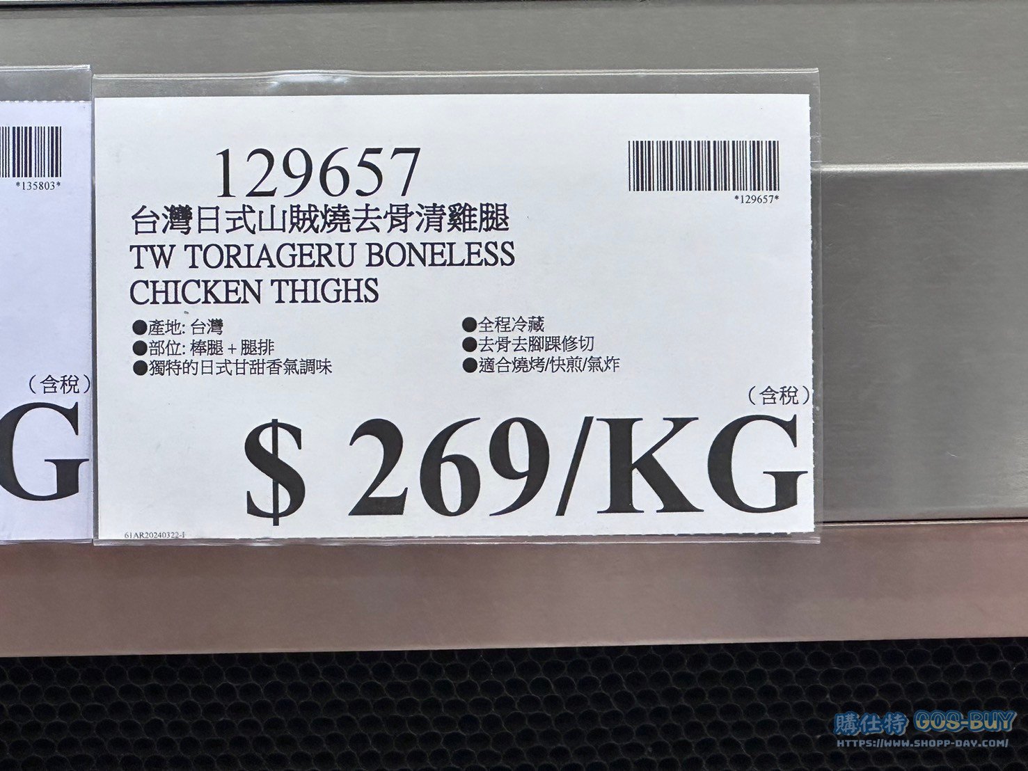 家食品麵包類冷藏食品 台灣日式山賊燒去骨清雞腿#129657 By 網站小編 2021 年 12 月 26 日 485 產品資訊 產品資訊 產品名稱 TW TORIAGERU BONELESS CHICKEN THIGHS 台灣日式山賊燒去骨清雞腿 #129657 價格 269/KG 產地 台灣 包裝規格 依包裝所示 保存期限 依包裝所示 備註 產地:台灣 部位:棒腿+腿排,獨特的日式甘甜香氣調味。全程冷藏、去骨去腳踝修切,適合燒烤/快煎/氣炸2024/3/13查價價格由285/KG降價為269/KG降價16/KG。 →商品問題回報← 相關 標籤去骨清雞腿雞肉雞腿 前一篇文章MONOPOLY LUNAR NEW YEAR 地產大亨農曆新春特別版 #133834下一篇文章KIRKLAND SIGNATURE 科克蘭帶尾特大生蝦仁 908G #777000 網站小編https://shopp-day.com 或許你也感興趣 價格優惠資訊 2025好市多客製生日蛋糕價格表 價格優惠資訊 好市多Line社群加入方法 保健品&藥品 新甘木堅胃腸藥顆粒40包 #194496 購仕特-CosBuy 查詢排行 價格優惠資訊 2025好市多客製生日蛋糕價格表 價格優惠資訊 好市多Line社群加入方法 保健品&藥品 新甘木堅胃腸藥顆粒40包 #194496 價格優惠資訊 2025好市多會員護照-春季專案商品一覽表 價格優惠資訊 好市多美國牛肉整箱銷售價格表(2024/5/7) 裝載更多 熱門推薦 價格優惠資訊 2025好市多客製生日蛋糕價格表 價格優惠資訊 好市多美國牛肉整箱銷售價格表(2024/5/7) 價格優惠資訊 好市多日本和牛價格表 2024.4.29更新 冷藏食品 美國特選無骨牛小排火鍋片#25737 冷藏食品 舊振南英式馬芬米福堡#143387 裝載更多