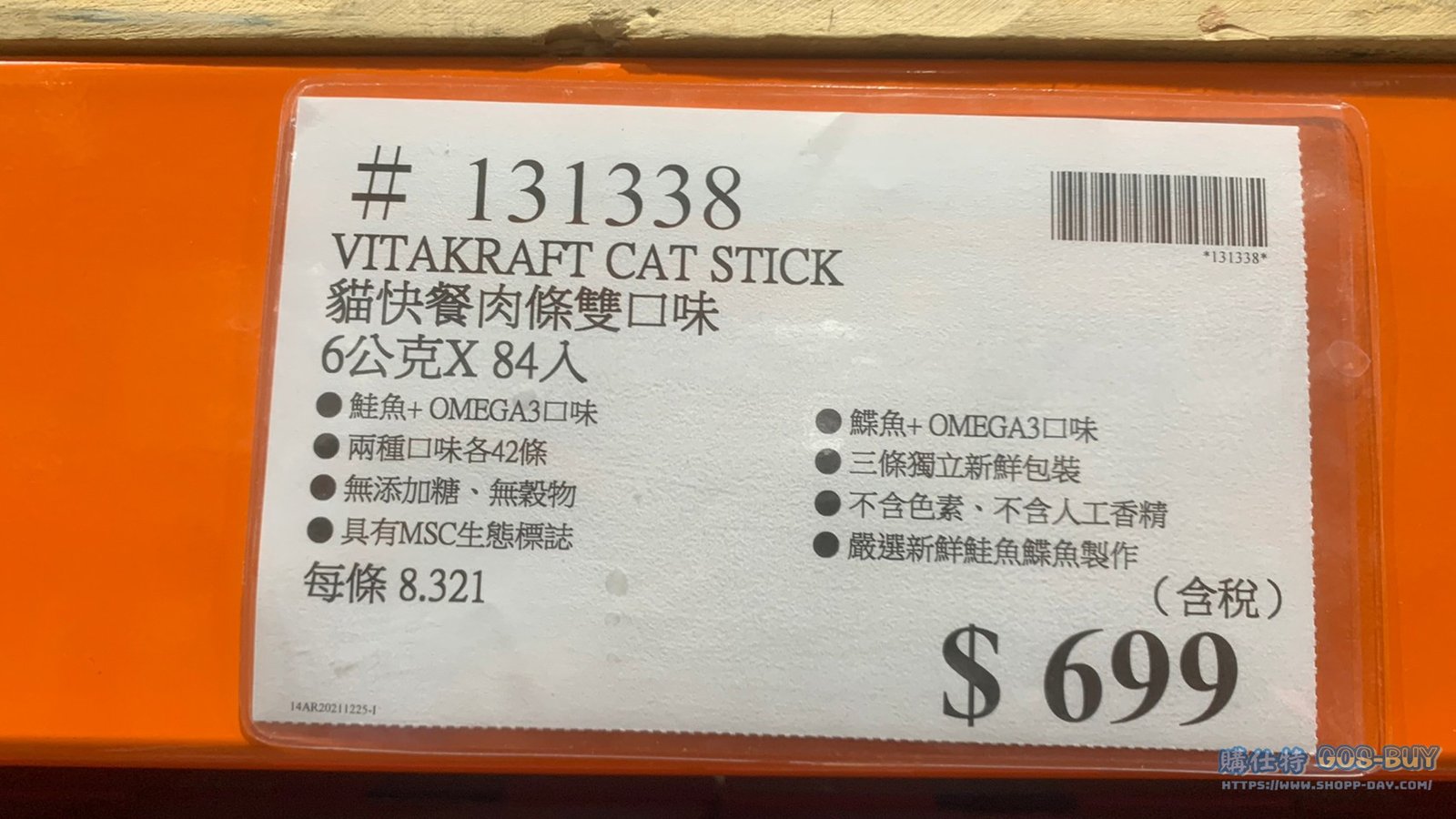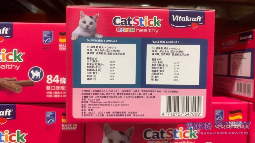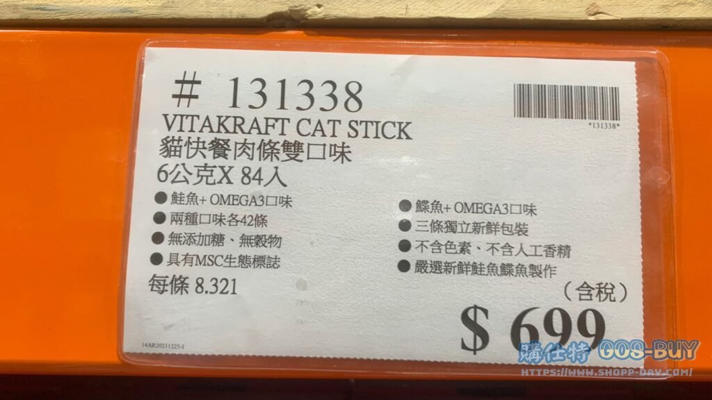 家廚房與居家生活相關寵物用品&食品 VITAKRAFT CAT STICK 貓快餐肉條雙口味 #131338 By 網站小編 2022 年 3 月 2 日 212 產品資訊 產品資訊 產品名稱VITAKRAFT CAT STICK 貓快餐肉條雙口味 #131338價格699產地德國包裝規格6公克X84入保存期限15個月備註鮭魚+OMEGA 3口味鰈魚+OMEGA 3口味兩種口味各42條三條獨立新鮮包裝無添加糖、無穀物不含色素、不含人工香精具有MSC生態標誌嚴選新鮮鮭魚鰈魚製作→商品問題回報← 相關 標籤肉條貓咪 前一篇文章科克蘭乾狗糧雞肉米蔬菜配方(小型犬) #253531下一篇文章KIRKLAND SIGNATURE 乾狗糧羊肉米蔬菜配方 18.14公斤 #131801 網站小編https://shopp-day.com 或許你也感興趣 價格優惠資訊 2025好市多客製生日蛋糕價格表 價格優惠資訊 好市多Line社群加入方法 保健品&藥品 新甘木堅胃腸藥顆粒40包 #194496 購仕特-CosBuy 查詢排行 價格優惠資訊 2025好市多客製生日蛋糕價格表 價格優惠資訊 好市多Line社群加入方法 保健品&藥品 新甘木堅胃腸藥顆粒40包 #194496 價格優惠資訊 2025好市多會員護照-春季專案商品一覽表 價格優惠資訊 好市多美國牛肉整箱銷售價格表(2024/5/7) 裝載更多 熱門推薦 廚房與居家生活相關 普拿疼伏冒熱飲20包 #84499 廚房與居家生活相關 DOMAINE DE LA BAUME 波姆酒莊金牌FITOU紅酒 #121971 廚房與居家生活相關 SIMON LI三人座牛皮沙發#1695608 廚房與居家生活相關 TAISHO大正胃腸藥顆粒52包 #126969 廚房與居家生活相關 IDEA NUOVA 摺疊椅 #1393843 裝載更多