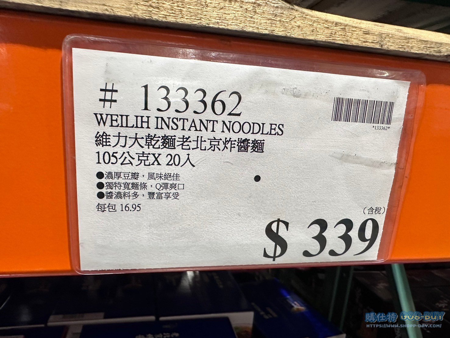 家食品麵包類常溫食品 維力大乾麵老北京炸醬麵#133362 By 網站小編 2022 年 2 月 22 日 265 產品資訊 產品資訊 產品名稱WEIL IH INSTANT NOODLES 維力大乾麵老北京炸醬麵 105公克X20入 #133362價格339產地台灣包裝規格105公克X20入保存期限依包裝所示備註濃厚豆瓣 風味絕佳獨特寬麵體 Q彈爽口醬濃料多 豐富享受2024/4/15查價價格由335漲價至339漲價4元→商品問題回報← 相關 標籤炸醬麵維力 前一篇文章銀川有機一等糙米 3公斤 #124095下一篇文章阿華田巧克力麥芽飲品組#358908 網站小編https://shopp-day.com 或許你也感興趣 價格優惠資訊 2025好市多客製生日蛋糕價格表 價格優惠資訊 好市多Line社群加入方法 保健品&藥品 新甘木堅胃腸藥顆粒40包 #194496 購仕特-CosBuy 查詢排行 價格優惠資訊 2025好市多客製生日蛋糕價格表 價格優惠資訊 好市多Line社群加入方法 保健品&藥品 新甘木堅胃腸藥顆粒40包 #194496 價格優惠資訊 2025好市多會員護照-春季專案商品一覽表 價格優惠資訊 好市多美國牛肉整箱銷售價格表(2024/5/7) 裝載更多 熱門推薦 價格優惠資訊 2025好市多客製生日蛋糕價格表 價格優惠資訊 好市多美國牛肉整箱銷售價格表(2024/5/7) 價格優惠資訊 好市多日本和牛價格表 2024.4.29更新 冷藏食品 美國特選無骨牛小排火鍋片#25737 冷藏食品 舊振南英式馬芬米福堡#143387 裝載更多