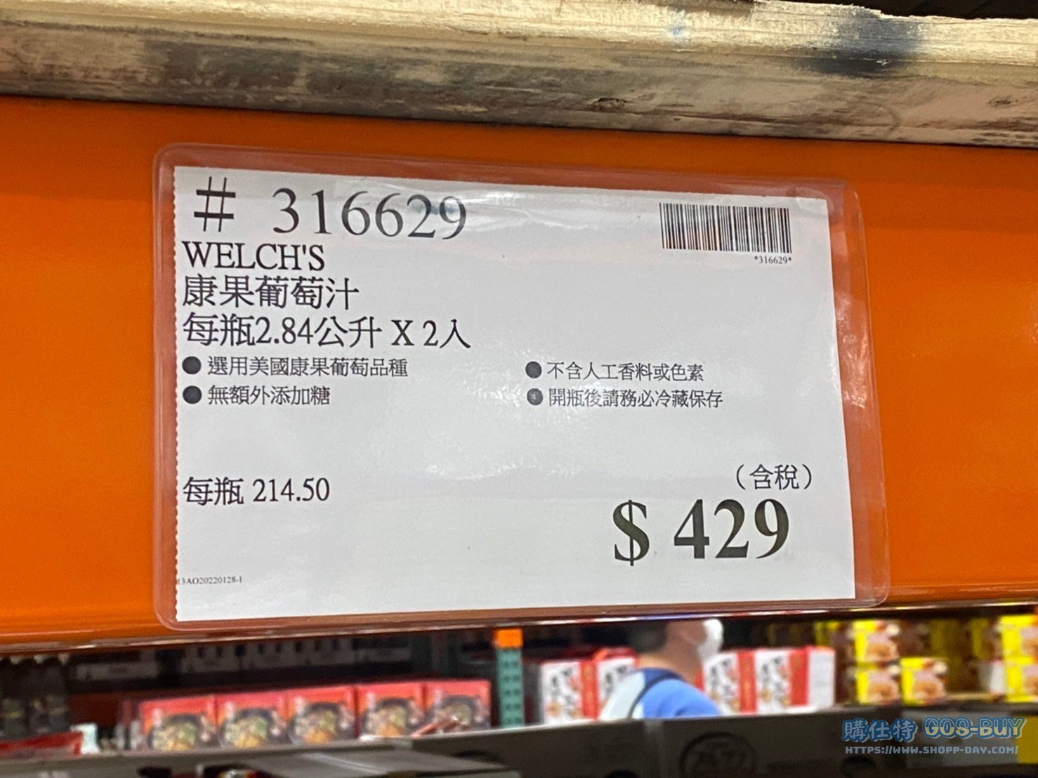 家零食&飲料 WELCH’S 康果葡萄汁 每瓶2.84公升X 2入 #316629 By 網站小編 2022 年 4 月 23 日 288 產品資訊 產品資訊 產品名稱WELCH’S 康果葡萄汁 每瓶2.84公升X 2入 #316629價格429產地美國包裝規格2.84公升 X 2入保存期限依包裝所示備註選用美國康果葡萄品種無額外添加糖不含人工香料或色素開瓶後請務必冷藏保存原汁含有率:99.91%→商品問題回報← 相關 標籤葡萄汁 前一篇文章紐西蘭香梨#4094下一篇文章APPLE 蘋果 IPHONE 13PRO 256G 128G #145054 #145058 #145092 網站小編https://shopp-day.com 或許你也感興趣 價格優惠資訊 2025好市多客製生日蛋糕價格表 價格優惠資訊 好市多Line社群加入方法 保健品&藥品 新甘木堅胃腸藥顆粒40包 #194496 購仕特-CosBuy 查詢排行 價格優惠資訊 2025好市多客製生日蛋糕價格表 價格優惠資訊 好市多Line社群加入方法 保健品&藥品 新甘木堅胃腸藥顆粒40包 #194496 價格優惠資訊 2025好市多會員護照-春季專案商品一覽表 價格優惠資訊 好市多美國牛肉整箱銷售價格表(2024/5/7) 裝載更多 熱門推薦 美國零食 科克蘭葡萄乾巧克力#959987 冷藏飲品 BLUE DIAMOND 無糖原味杏仁飲1.89L #129794 西班牙零食 MR.BROWNIE 巧克力布郎尼#153753 泰國零食 A&R牛奶巧克力迷你甜筒餅乾#1744884 比利時零食 科克蘭烈酒與波特酒巧克力 #1351451 裝載更多