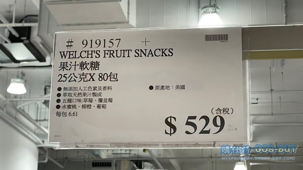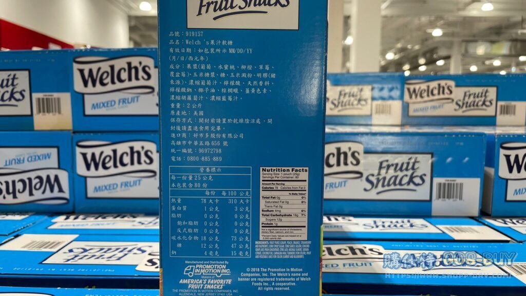 家零食&飲料美國零食 WELCH’S FRUIT SNACKS 果汁軟糖 25公克X80包 #919157 By 網站小編 2022 年 3 月 9 日 234 產品資訊 產品資訊 產品名稱WELCH’S FRUIT SNACKS 果汁軟糖 25公克X80包 #919157價格529產地美國包裝規格25公克X80包保存期限依包裝所示備註無添加人工色素及香料萃取天然果汁製成五種口味:草莓 覆盆莓水蜜桃、柳橙、葡萄。→商品問題回報← 相關 標籤果汁美國軟糖 前一篇文章KOREAN CHESTNUT 韓國大栗子 1.5公斤 #135498下一篇文章DONGWON PORRIDGE ABALONE DONGWON韓國鮑魚多穀粥285公克4包入 #500198 網站小編https://shopp-day.com 或許你也感興趣 價格優惠資訊 2025好市多客製生日蛋糕價格表 價格優惠資訊 好市多Line社群加入方法 保健品&藥品 新甘木堅胃腸藥顆粒40包 #194496 購仕特-CosBuy 查詢排行 價格優惠資訊 2025好市多客製生日蛋糕價格表 價格優惠資訊 好市多Line社群加入方法 保健品&藥品 新甘木堅胃腸藥顆粒40包 #194496 價格優惠資訊 2025好市多會員護照-春季專案商品一覽表 價格優惠資訊 好市多美國牛肉整箱銷售價格表(2024/5/7) 裝載更多 熱門推薦 美國零食 科克蘭葡萄乾巧克力#959987 冷藏飲品 BLUE DIAMOND 無糖原味杏仁飲1.89L #129794 西班牙零食 MR.BROWNIE 巧克力布郎尼#153753 泰國零食 A&R牛奶巧克力迷你甜筒餅乾#1744884 比利時零食 科克蘭烈酒與波特酒巧克力 #1351451 裝載更多