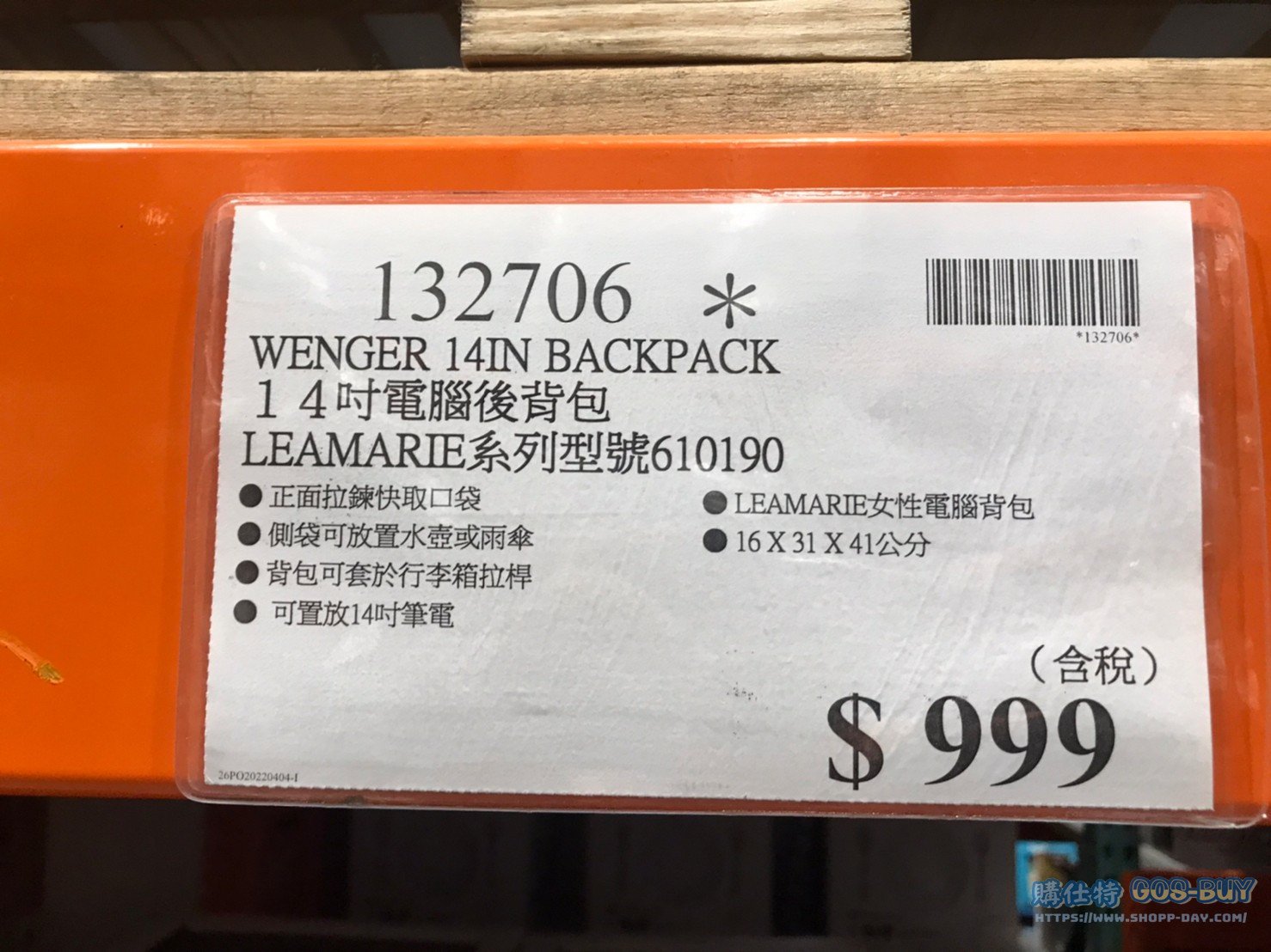 家服飾類配件類包包 WENGER 14IN BACKPACK 14吋電腦後背包 LEAMARIE系列 #132706 By 網站小編 2021 年 11 月 14 日 493 產品資訊 產品資訊 產品名稱WENGER 14IN BACKPACK 14吋電腦後背包 LEAMARIE系列 型號610190 #132706價格999產地中國包裝規格一入(型號:610190)保存期限N/A備註正面拉鍊快取口袋側袋可放置水壺或雨傘背包可套於行李箱拉桿可置放14吋筆電LEAMARIE女性電腦背包16X31X40公分→商品問題回報← 相關 標籤14吋WENGER後背包電腦包 前一篇文章JOHNSONVILLE BREAKFAST SAUSAGE 早餐腸272G X 2PK #1127001下一篇文章VOYAGE MICRO DRONE 微型遙控飛行機 #1422628 網站小編https://shopp-day.com 或許你也感興趣 價格優惠資訊 2025好市多客製生日蛋糕價格表 價格優惠資訊 好市多Line社群加入方法 保健品&藥品 新甘木堅胃腸藥顆粒40包 #194496 購仕特-CosBuy 查詢排行 價格優惠資訊 2025好市多客製生日蛋糕價格表 價格優惠資訊 好市多Line社群加入方法 保健品&藥品 新甘木堅胃腸藥顆粒40包 #194496 價格優惠資訊 2025好市多會員護照-春季專案商品一覽表 價格優惠資訊 好市多美國牛肉整箱銷售價格表(2024/5/7) 裝載更多 熱門推薦 廚房與居家生活相關 普拿疼伏冒熱飲20包 #84499 廚房與居家生活相關 DOMAINE DE LA BAUME 波姆酒莊金牌FITOU紅酒 #121971 廚房與居家生活相關 SIMON LI三人座牛皮沙發#1695608 廚房與居家生活相關 TAISHO大正胃腸藥顆粒52包 #126969 廚房與居家生活相關 IDEA NUOVA 摺疊椅 #1393843 裝載更多